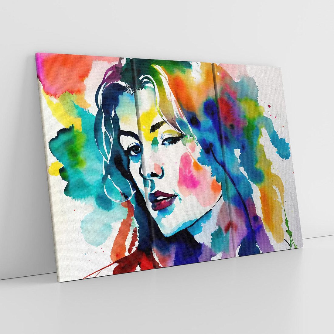 Czarna kreska w abstrakcyjnym portrecie kobiety jest delikatną osią, która kontrastuje z ekspresyjnymi akwarelowymi plamami rozpryśniętymi na płótnie. To zmysłowe połączenie wydobywa osobowość i emocje postaci , tworząc fascynujący taniec formy i koloru.