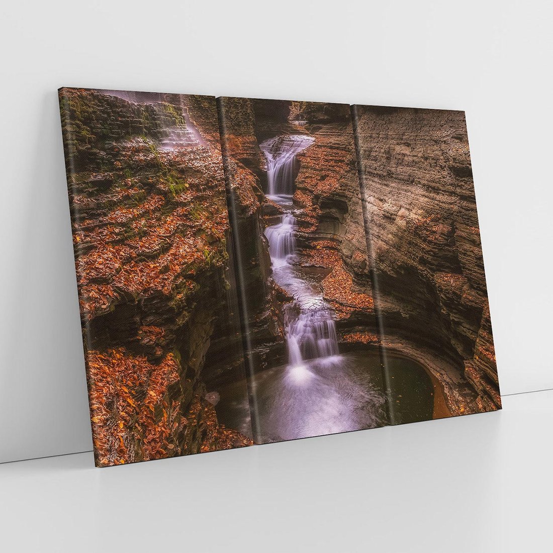 Ten uroczy obraz strumienia płynącego przez jesienny las wprowadzi do Twojego wnętrza barwną harmonię natury. Poczuj spokój i magiczną atmosferę jesieni. Dodaj przytulności i naturalnego piękna do swojego wnętrza.