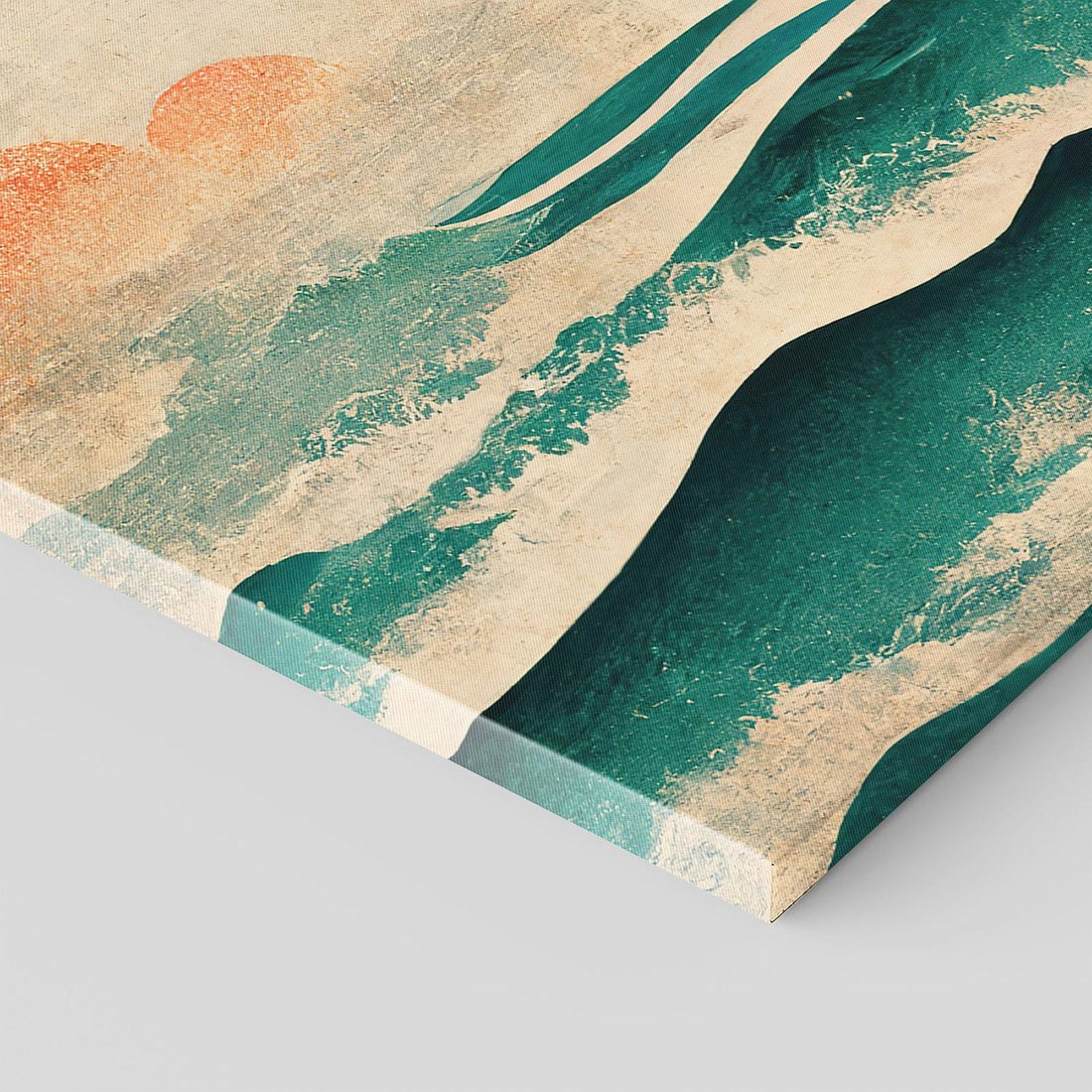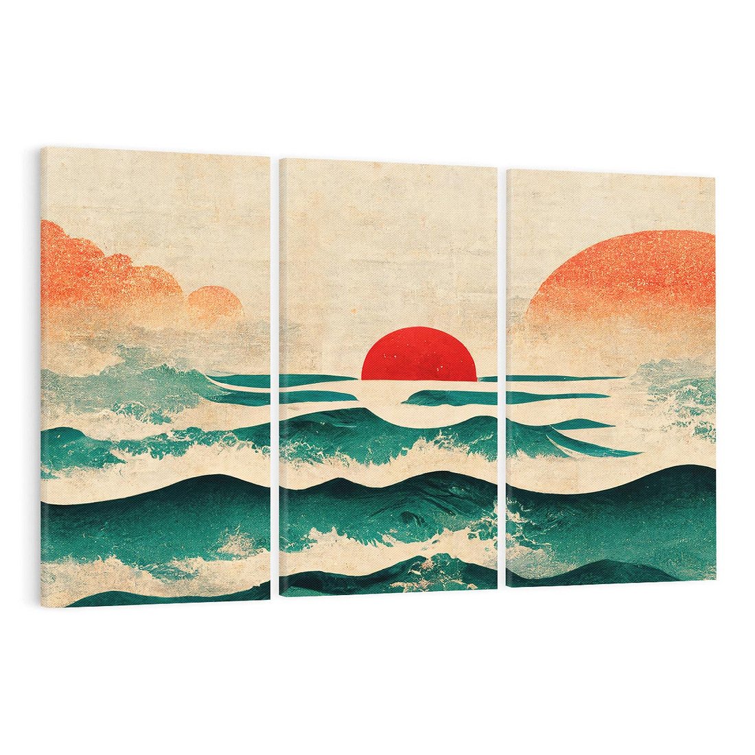 Japońska sztuka na płótnie, która przenosi nas w świat spokoju i harmonii. Widok zachodu słońca nad oceanem malowany na starym papirusie emanuje mistycznym urokiem. Styl japandi, charakteryzujący się minimalistycznym pięknem, doskonale współgra z dynamiką fal. Czerwone słońce nadaje obrazowi wyjątkowego nastroju, przenosząc nas w pejzaż dalekiej Japonii. To dzieło sztuki, które oczarowuje i zachwyca.