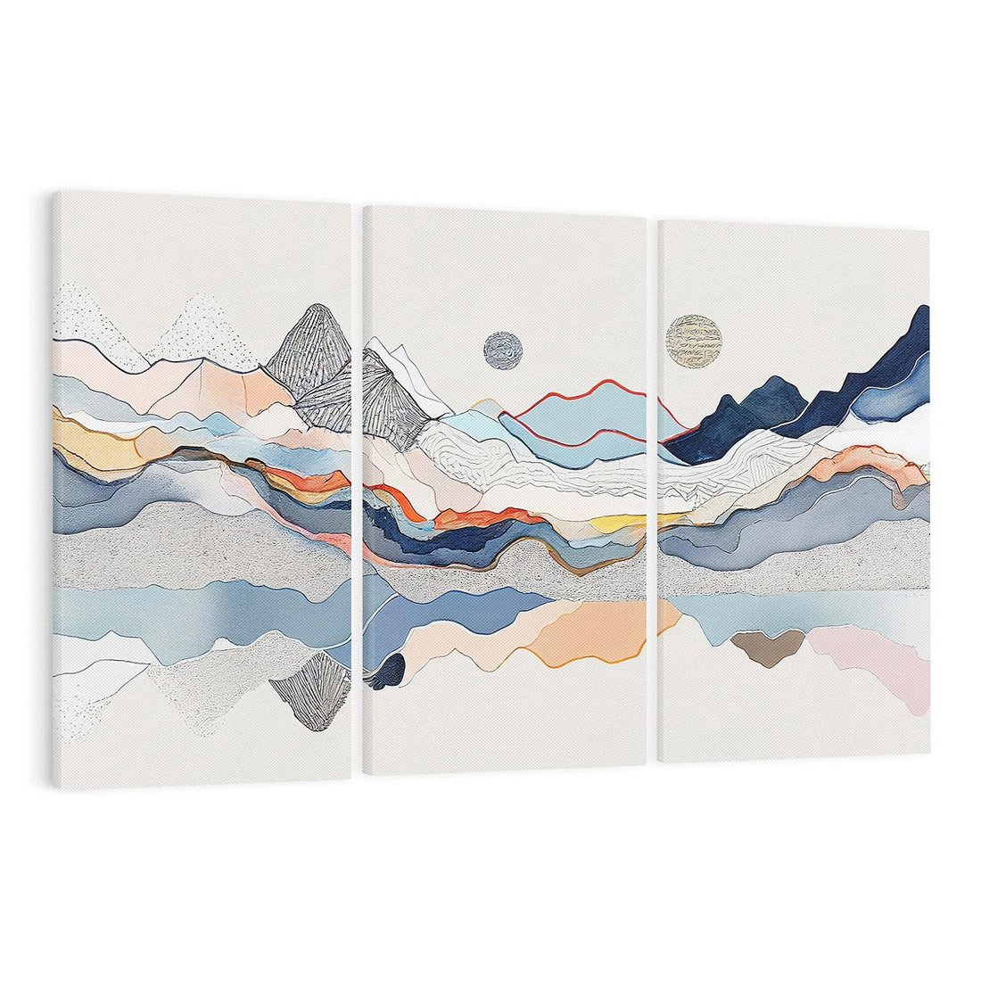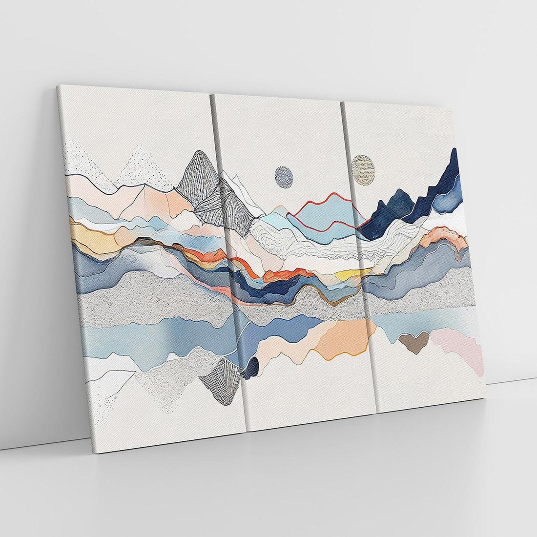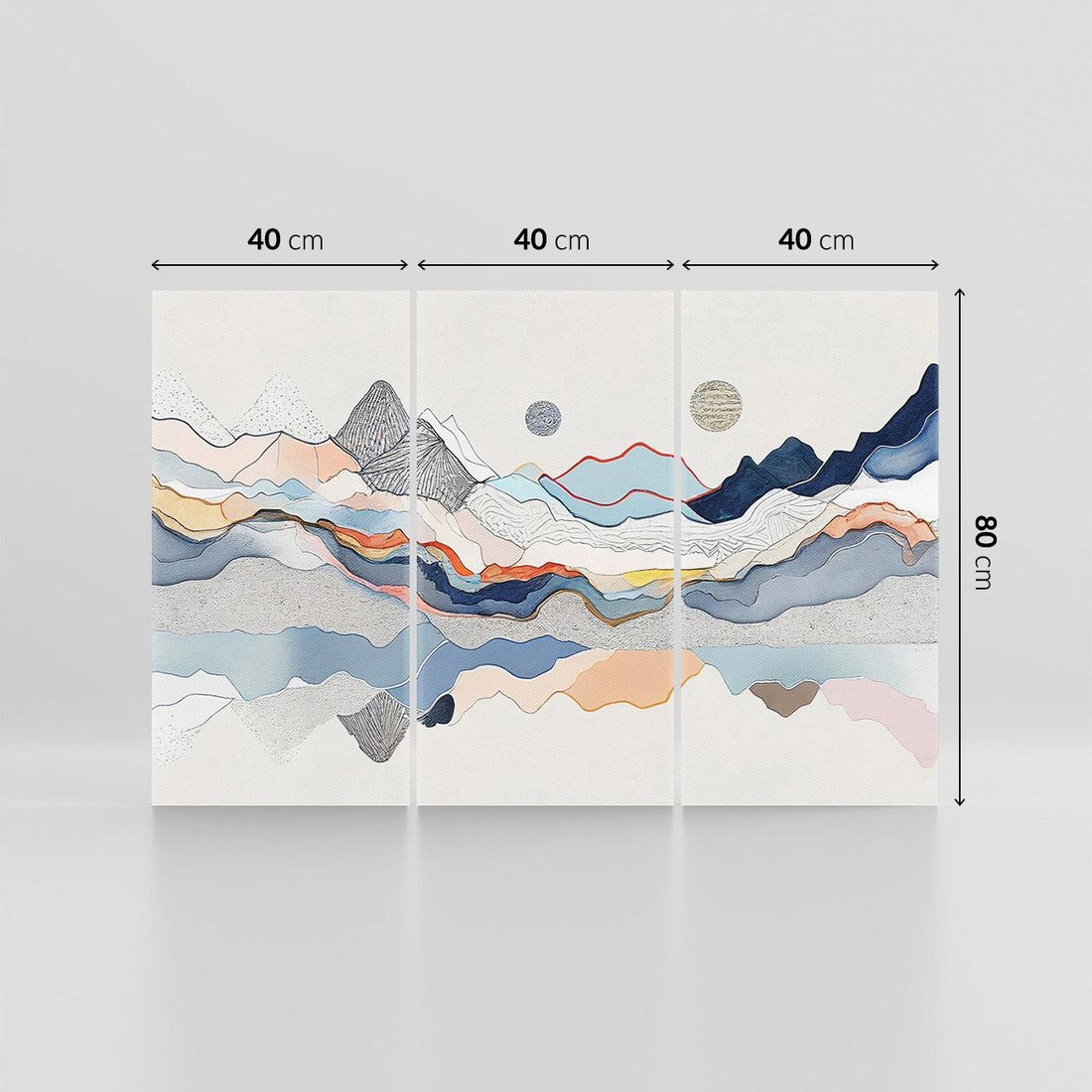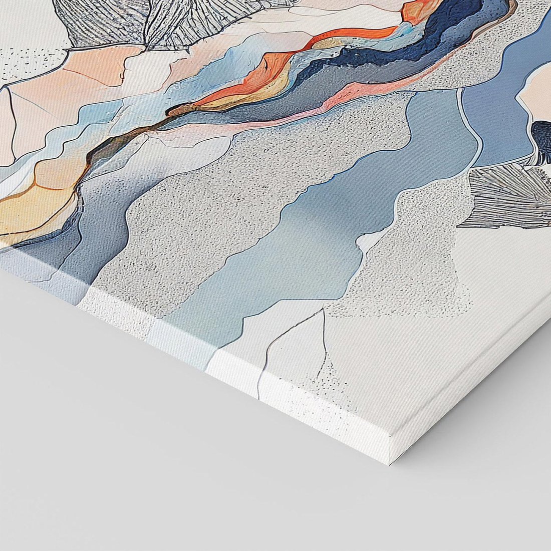 To akwarelowe malowidło łączy graficzne góry z różnymi teksturami, tworząc dynamiczną reprezentację natury. Nowoczesna abstrakcja pasuje do każdego wnętrza, dodając wyjątkowy i inspirujący akcent.