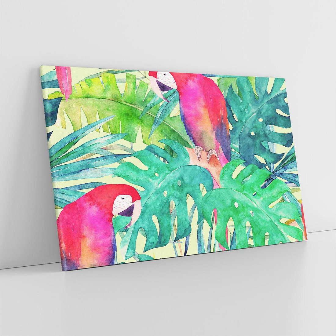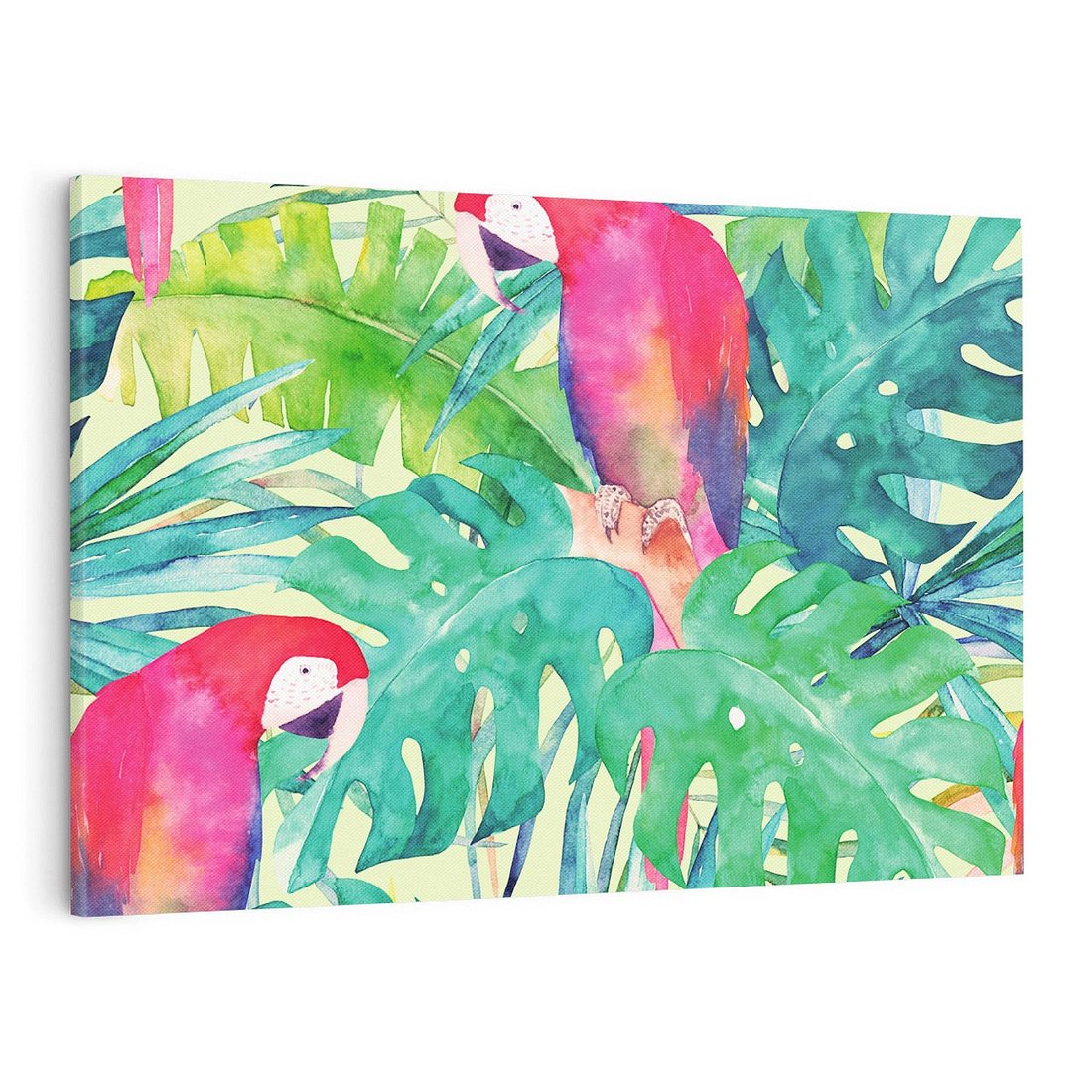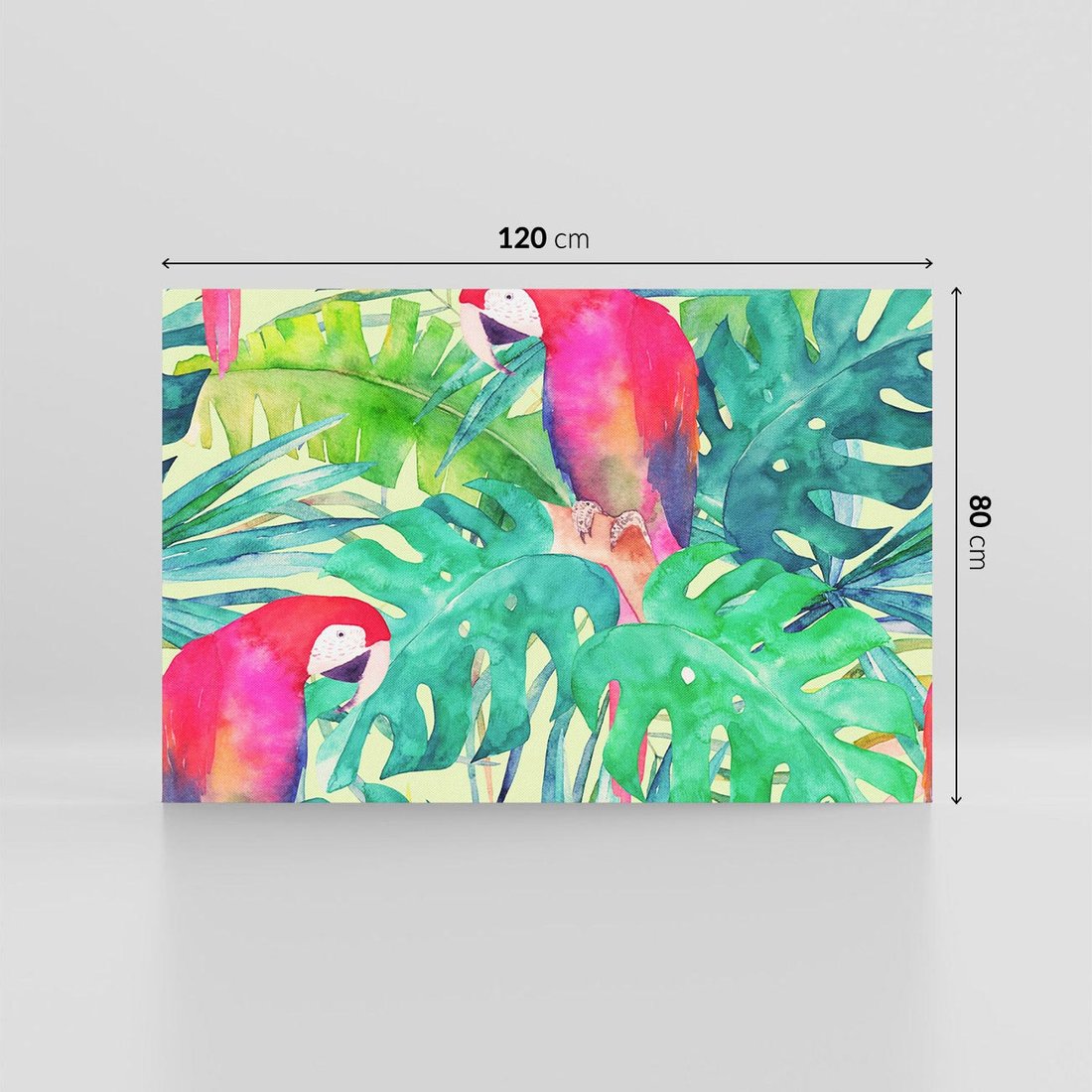 Ta egzotyczna kompozycja przedstawiająca tropikalne liście i papugi wprowadzi do Twojego wnętrza atmosferę egzotycznej przygody i kolorowego świata natury. Odkryj bogactwo kształtów i intensywność barw. Dodaj tropikalnego uroku i wyrazistości do swojego wnętrza.