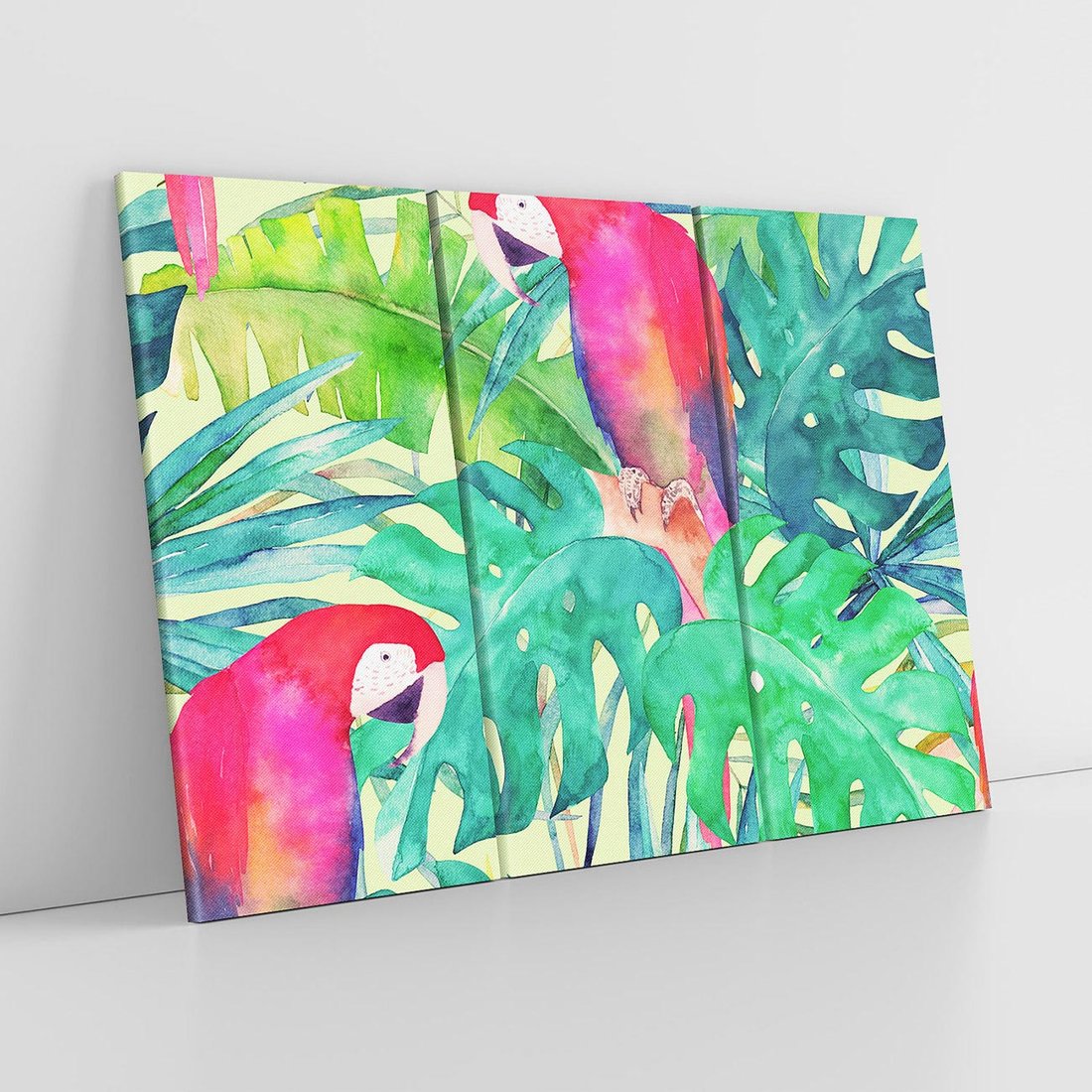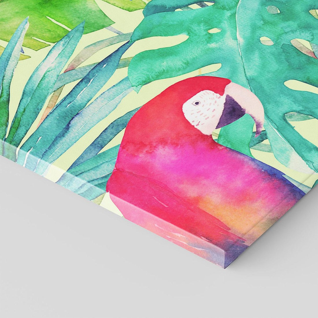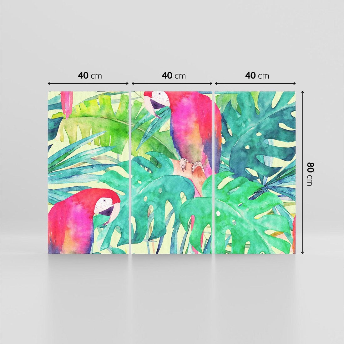 Ta egzotyczna kompozycja przedstawiająca tropikalne liście i papugi wprowadzi do Twojego wnętrza atmosferę egzotycznej przygody i kolorowego świata natury. Odkryj bogactwo kształtów i intensywność barw. Dodaj tropikalnego uroku i wyrazistości do swojego wnętrza.