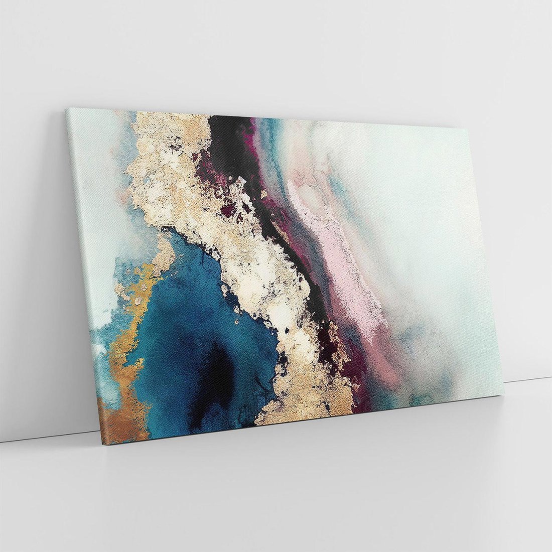 Odkryj złoty impuls w tym abstrakcyjnym obrazie z turkusowymi plamami i rozlaną farbą. Czerń wprowadza dynamikę, a złote elementy dodają wytworności, tworząc efektowną sztukę na płótnie.