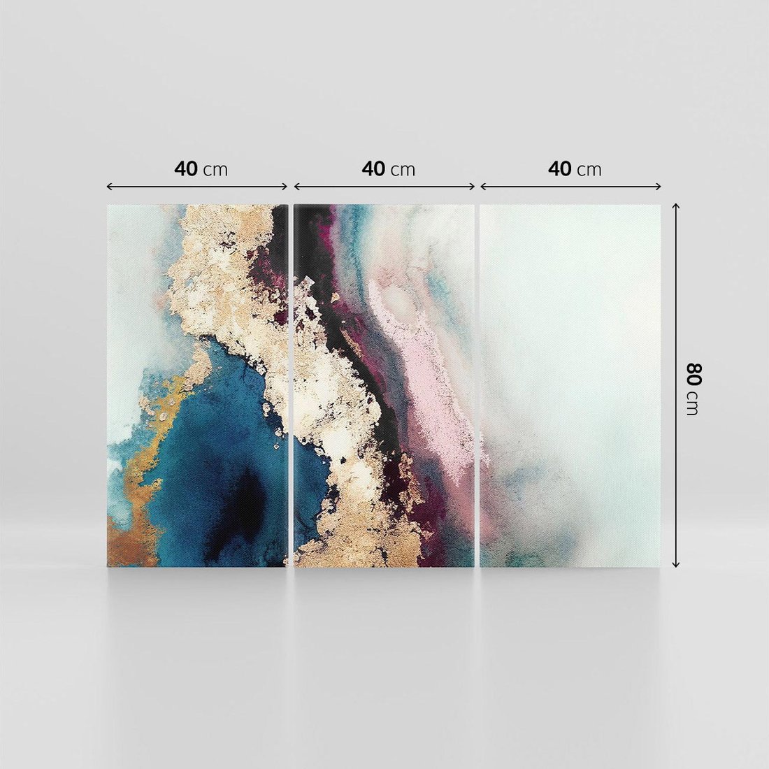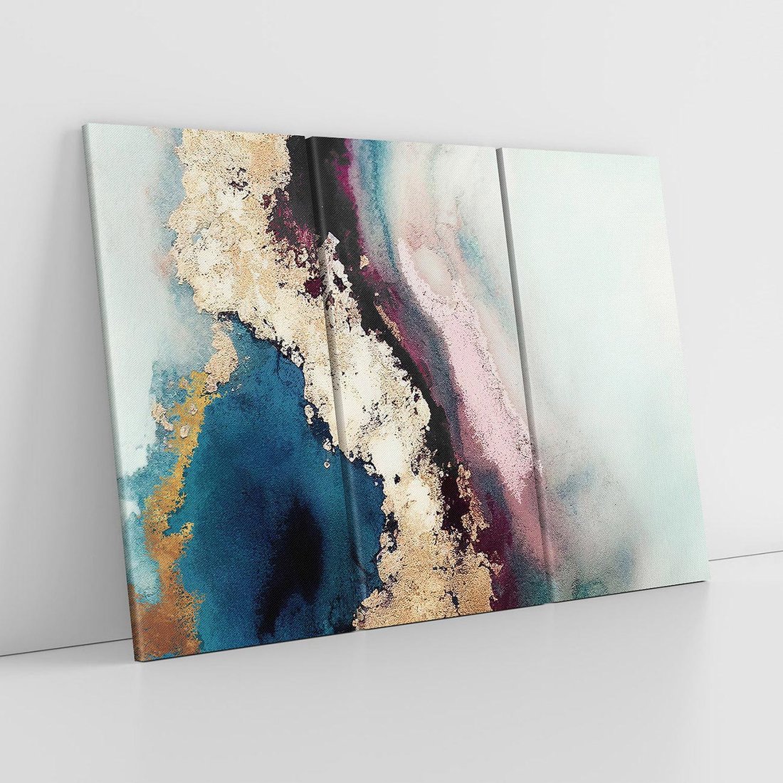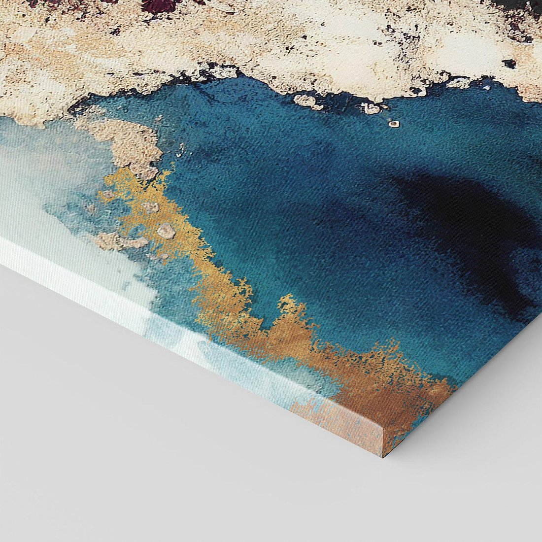 Odkryj złoty impuls w tym abstrakcyjnym obrazie z turkusowymi plamami i rozlaną farbą. Czerń wprowadza dynamikę, a złote elementy dodają wytworności, tworząc efektowną sztukę na płótnie.