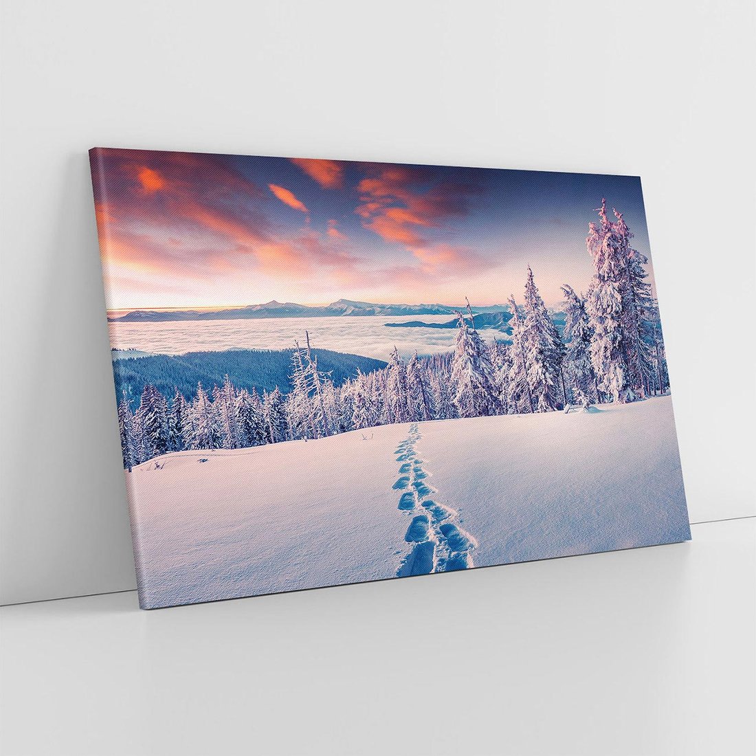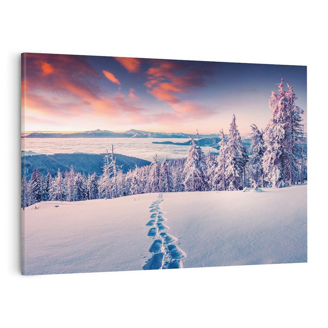 Przenieś się w spokojną atmosferę zimowych gór dzięki temu uroczemu obrazowi. Białe szczyty, pokryte śniegiem drzewa i chłodna aura tworzą harmonijną kompozycję. Ten obraz dodaje spokoju i ukojenia, idealny dla miłośników zimy i piękna przyrody górskiej.