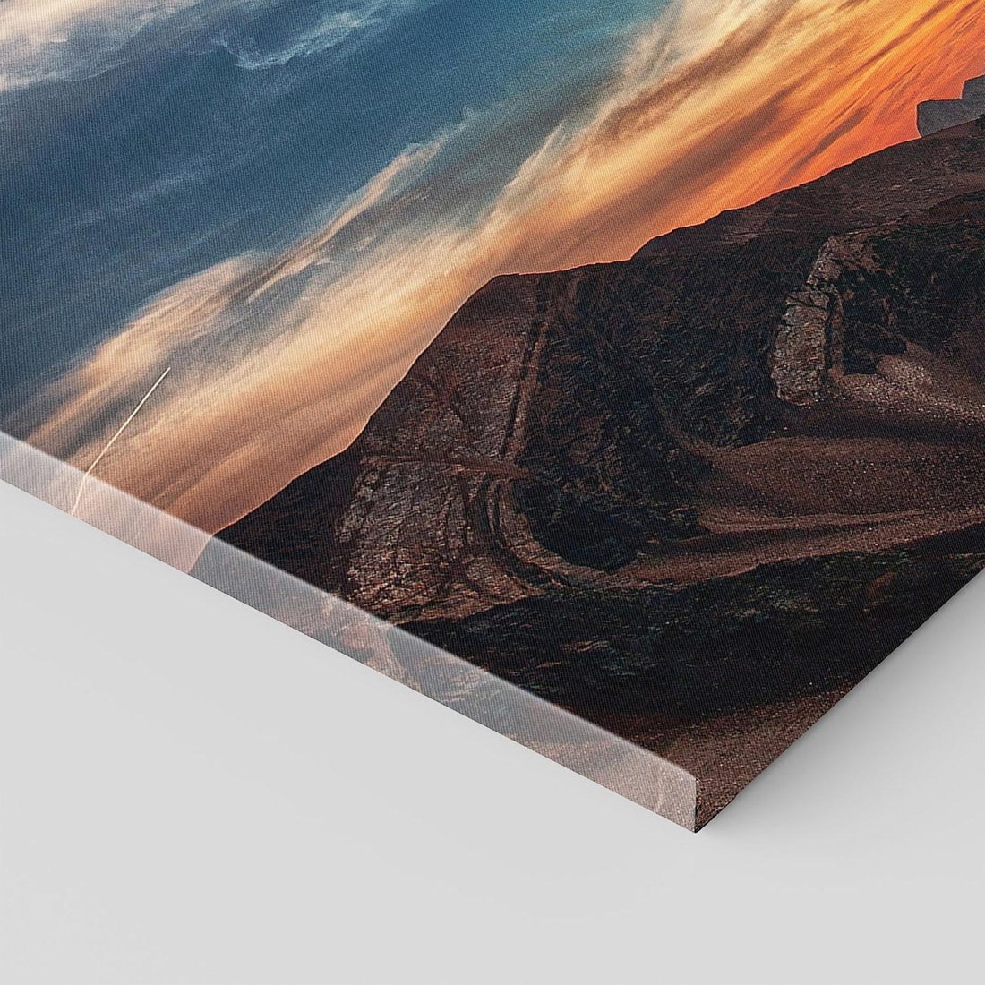 Inspirujący obraz na płótnie ukazujący góry otoczone pięknym krajobrazem. Wykorzystanie kolorów i detali oddaje wspaniałość przyrody, tworząc harmonijną atmosferę.