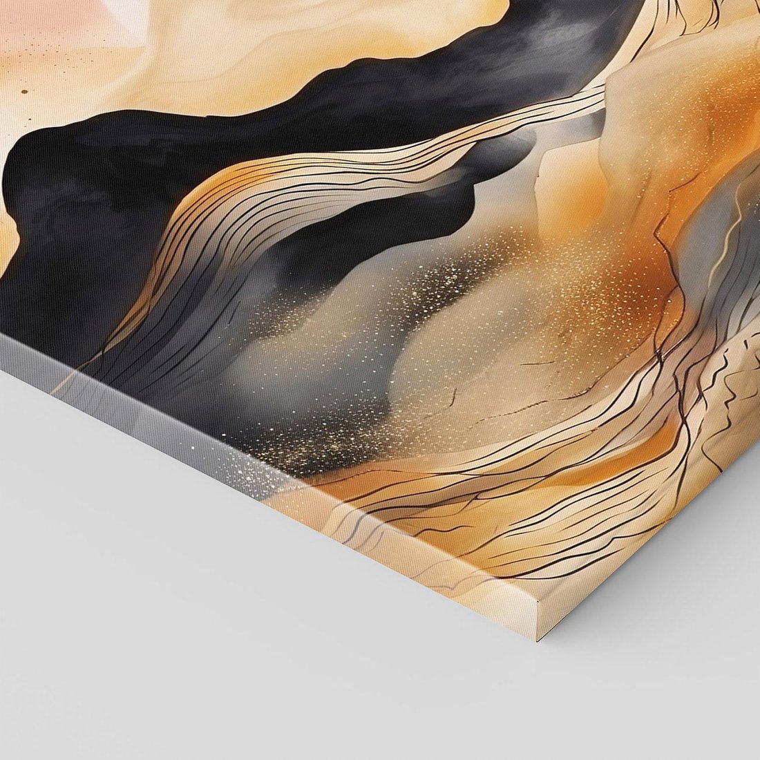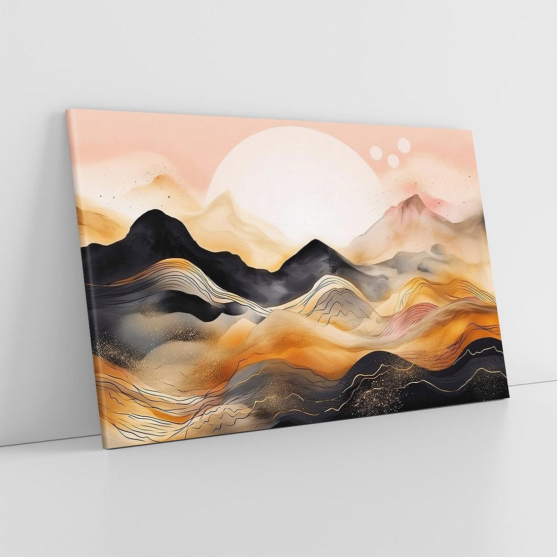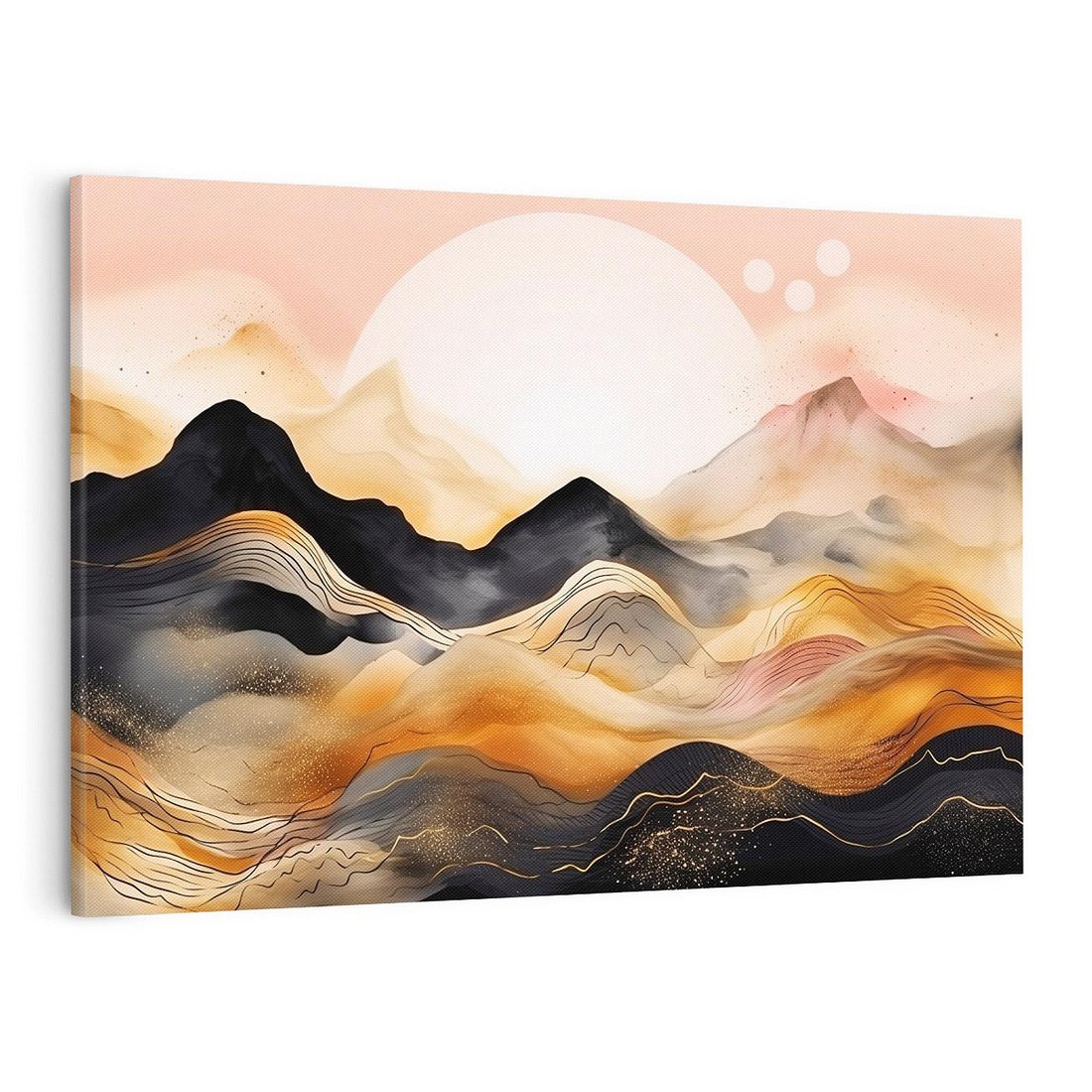 Ta nowoczesna grafika ukazuje urok zachodu słońca nad czarnymi górami. Odcienie pastelowego różu i złota tworzą magiczną atmosferę, przenosząc widza w malowniczy krajobraz. To artystyczne dzieło oddaje piękno natury i wprowadzi harmonię oraz ciepło do każdego wnętrza.