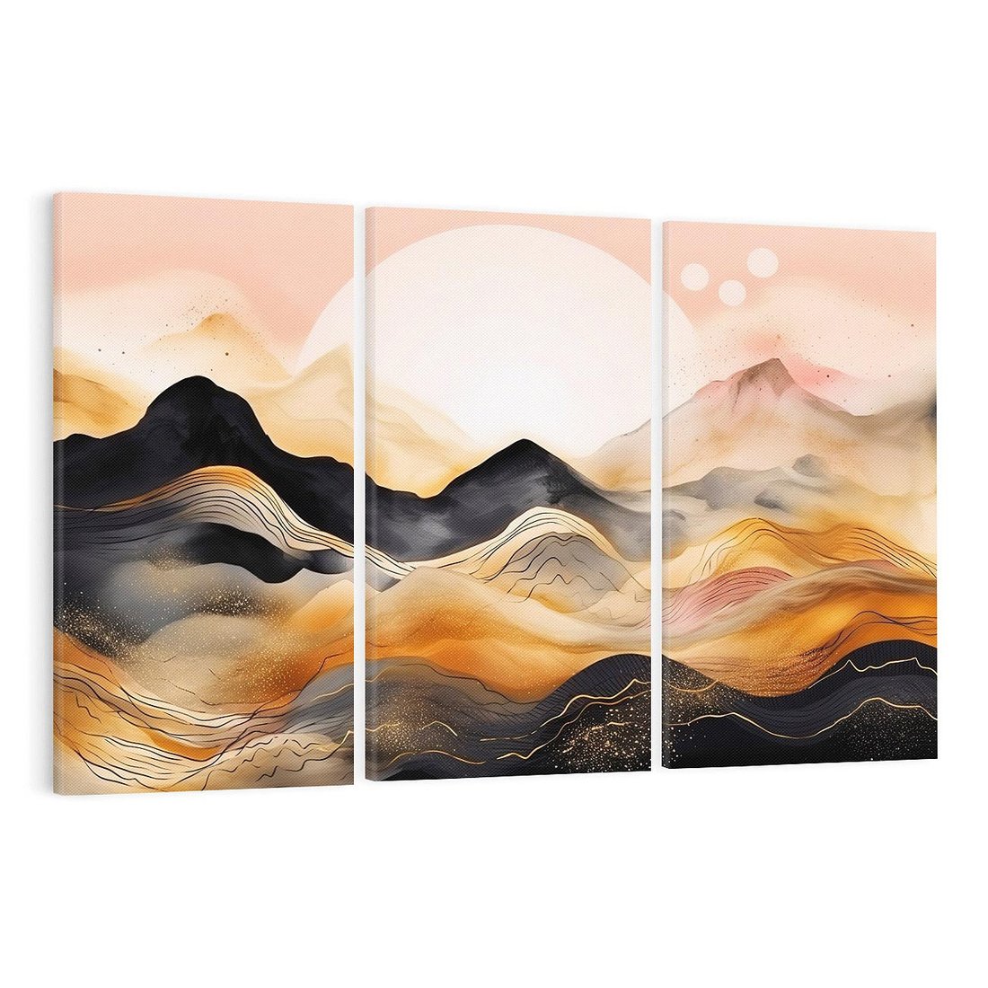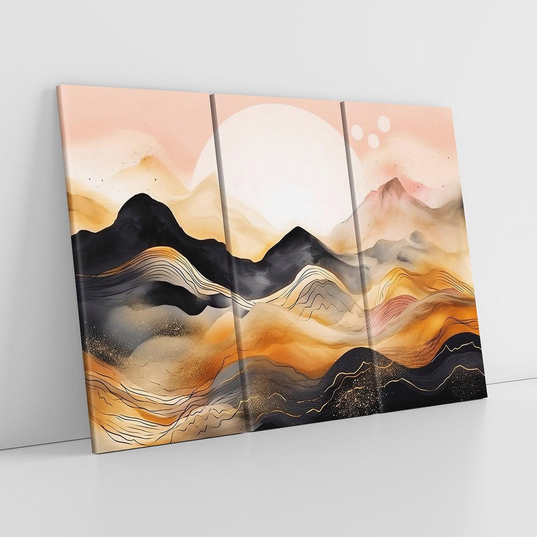 Ta nowoczesna grafika ukazuje urok zachodu słońca nad czarnymi górami. Odcienie pastelowego różu i złota tworzą magiczną atmosferę, przenosząc widza w malowniczy krajobraz. To artystyczne dzieło oddaje piękno natury i wprowadzi harmonię oraz ciepło do każdego wnętrza.