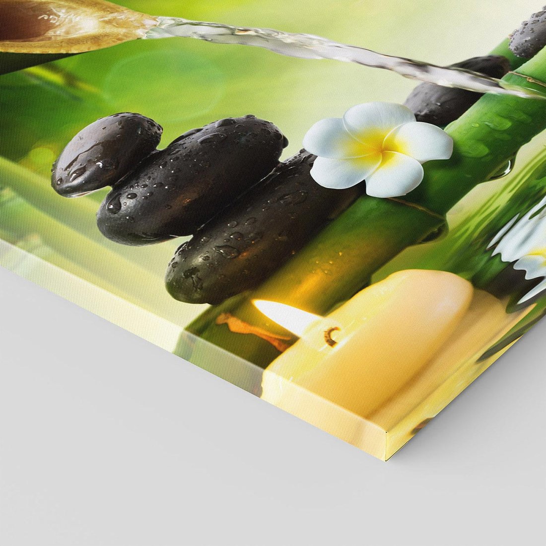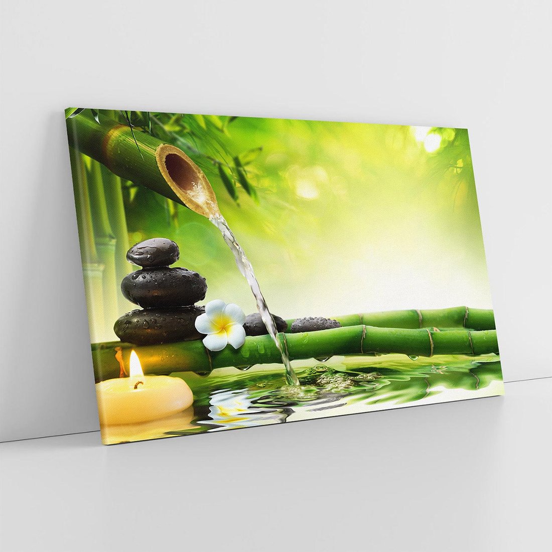Ożyw swoje wnętrze tym uroczym obrazem przedstawiającym harmonię natury. Delikatne liście bambusa, spokojnie spływająca woda i ułożone kamienie tworzą relaksacyjną atmosferę. Ta kompozycja dodaje równowagi i spokoju, idealna dla osób pragnących stworzyć w domu oazę harmonii i zen.