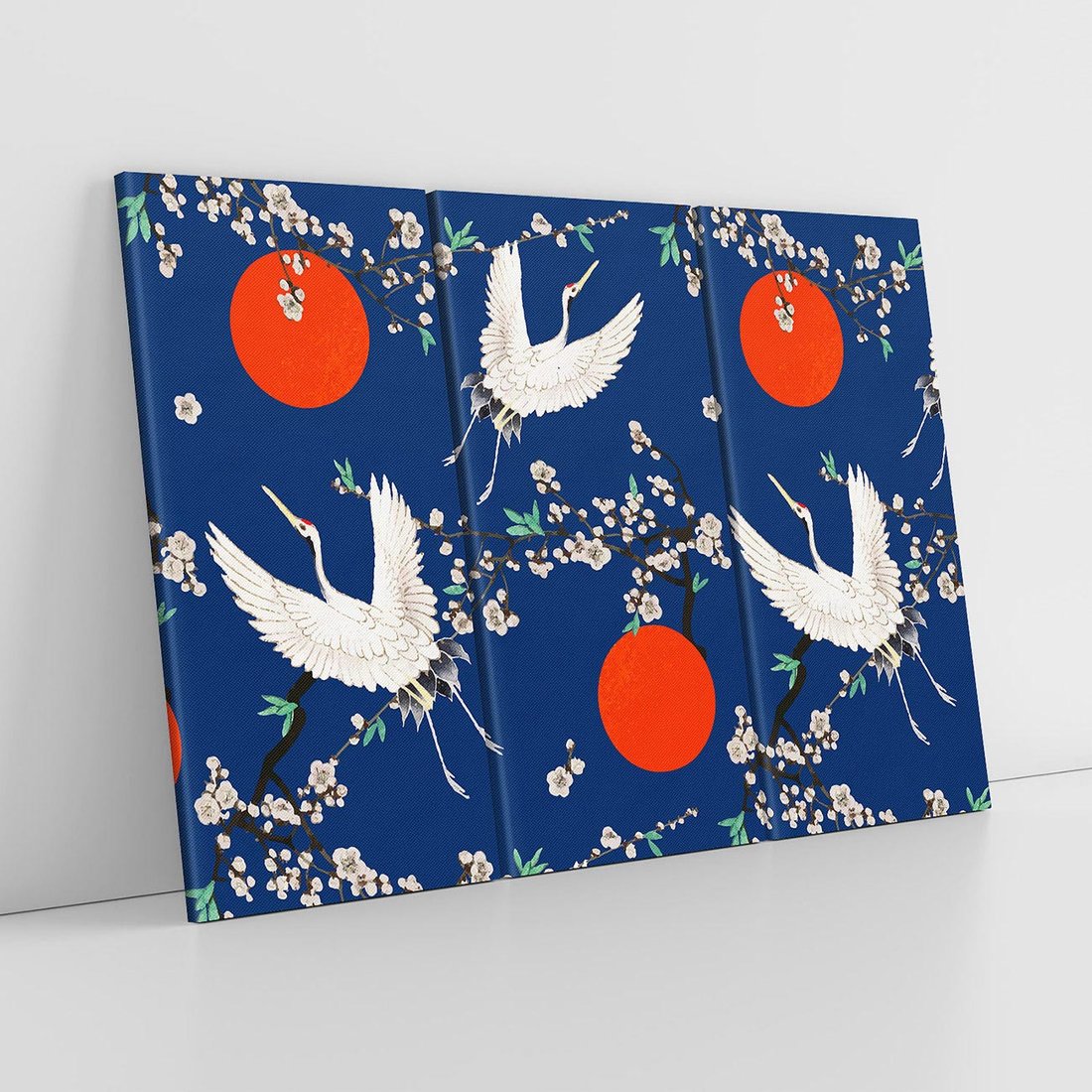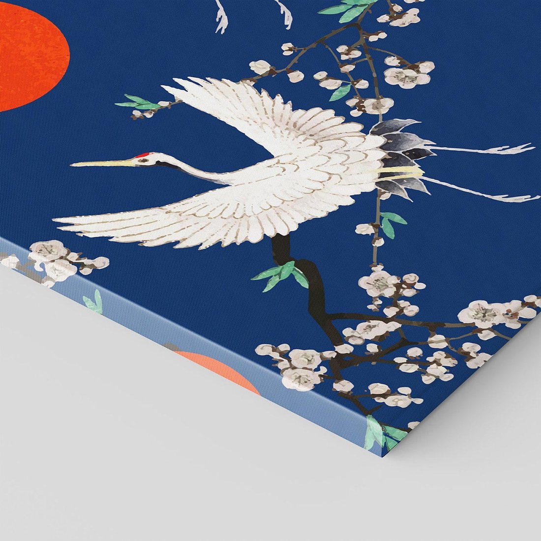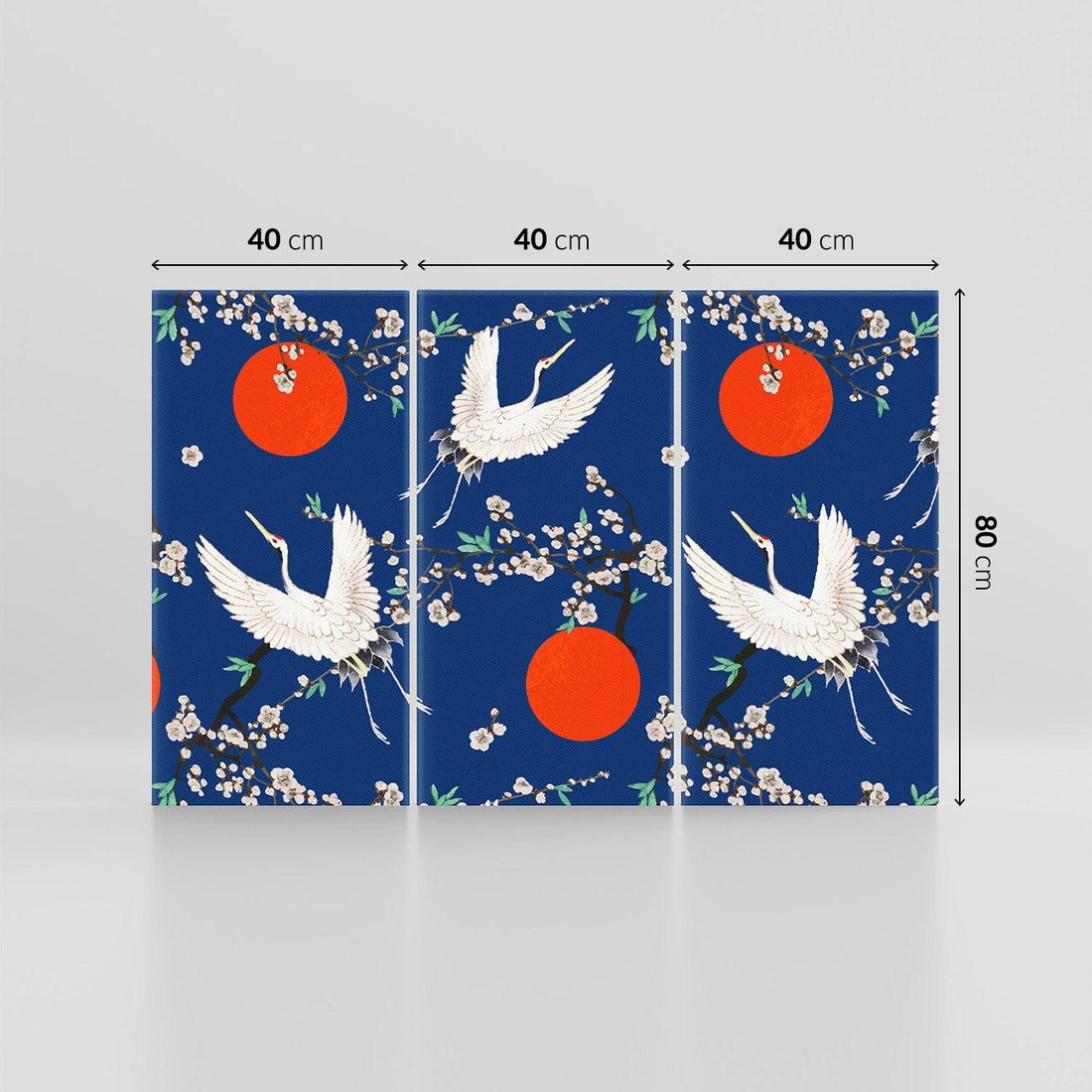Ten obraz przedstawia japońskie żurawie na tle indygo z delikatnymi kwiatami wiśni. Czerwone akcenty dodają dynamiki i głębi kompozycji. Sztuka japońska emanuje harmonią i elegancją, a motyw żurawi symbolizuje długowieczność i szczęście. To wyjątkowe dzieło sztuki przeniesie przestrzeń w magiczny świat Japonii i subtelnej poezji.