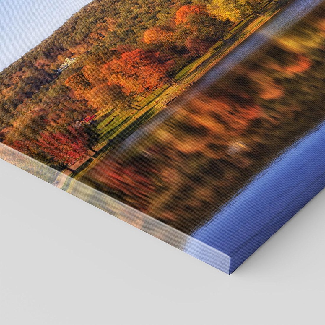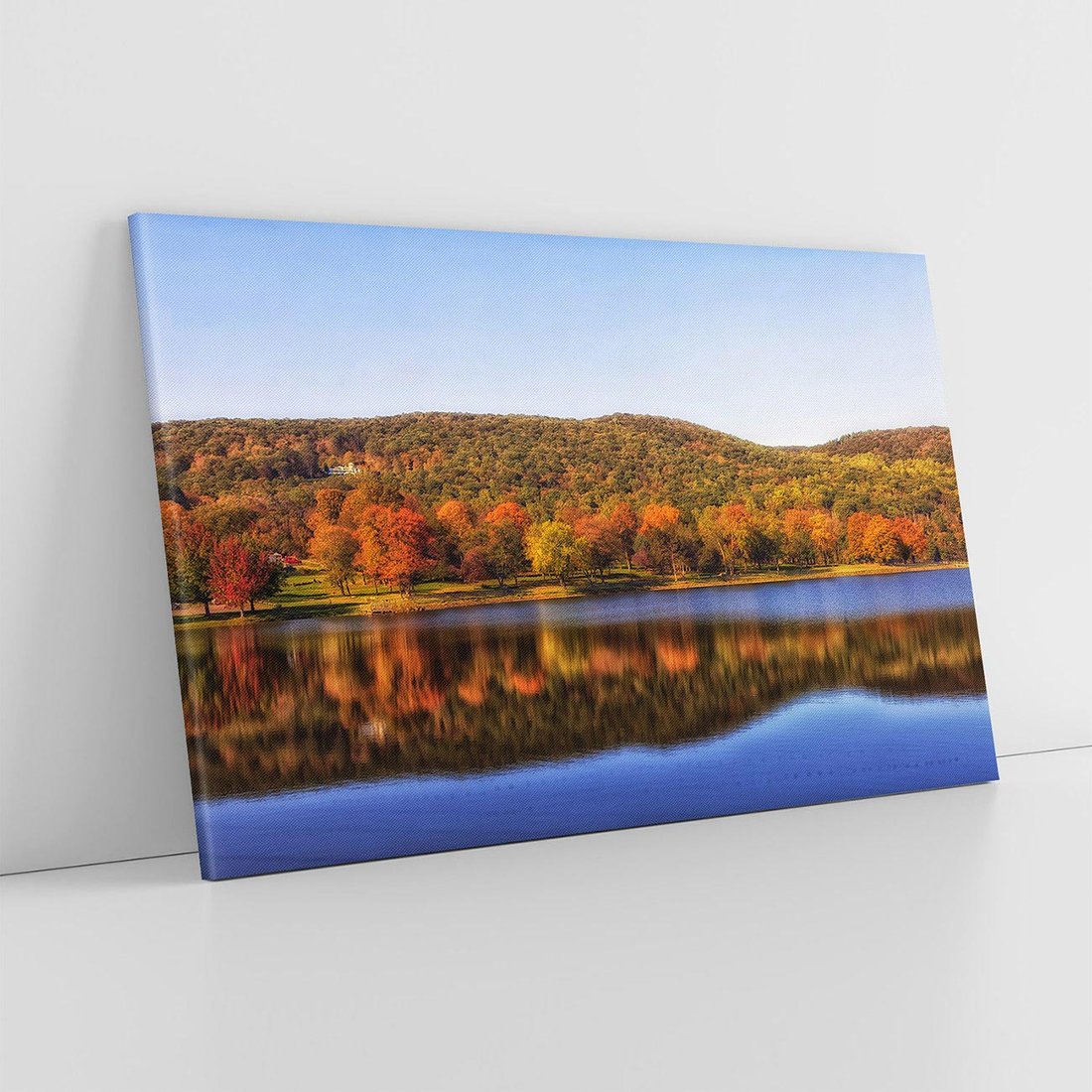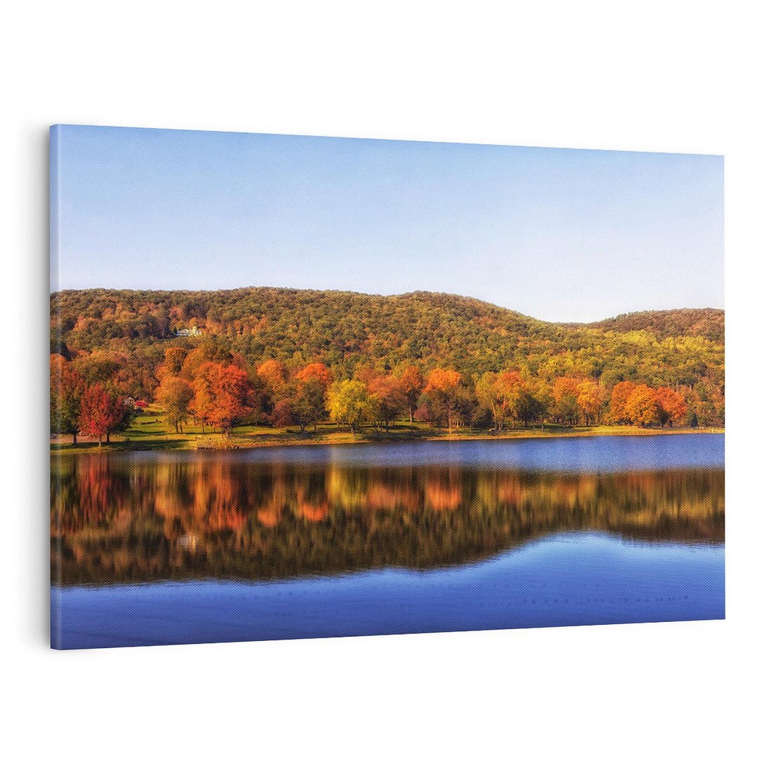 Odkryj urok przyrody dzięki temu malowniczemu obrazowi przedstawiającemu jezioro otoczone lasem. Spokojna tafla wody, bujna roślinność i odbicie nieba tworzą harmonijną aurę. Ta kompozycja dodaje spokoju i relaksu, idealna dla miłośników natury i chcących wprowadzić do swojego wnętrza malowniczy krajobraz jeziora w lesie.