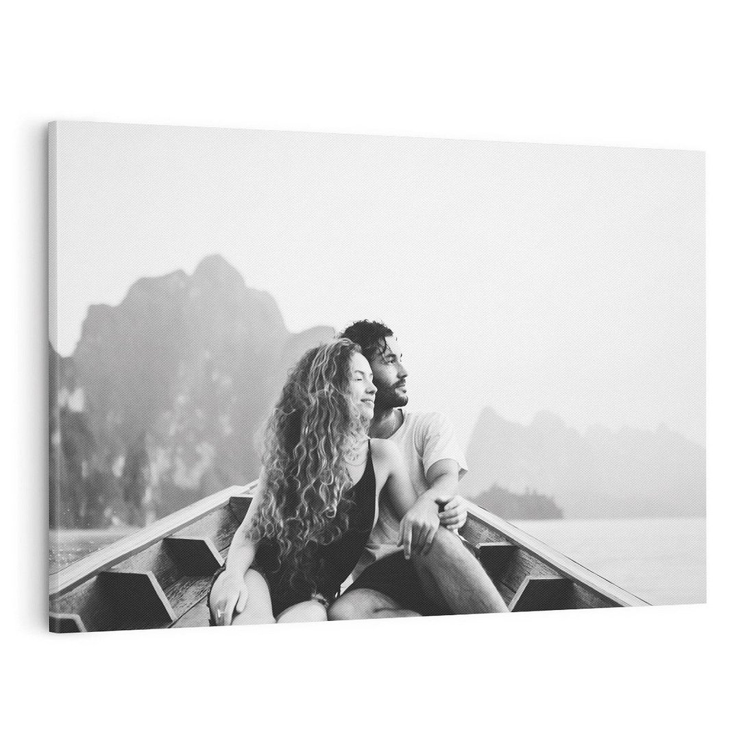 Obraz na płótnie 120x80 - Księga mglistych marzeń - czarno biała fotografia, para zakochanych w łodzi