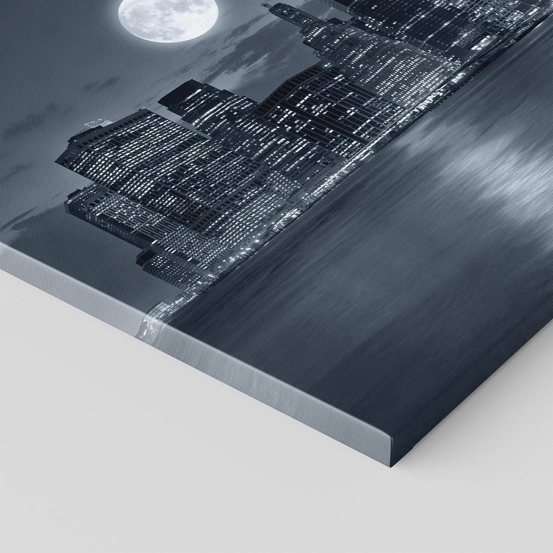 Przenieś się w magię nocnego miasta dzięki temu uroczemu obrazowi przedstawiającemu księżyc. Błękitne odcienie, migoczące światła i tajemnicza atmosfera tworzą niepowtarzalną aurę. Ten obraz dodaje romantycznego nastroju i tajemniczości, idealny dla miłośników nocnych pejzaży i magicznych chwil.