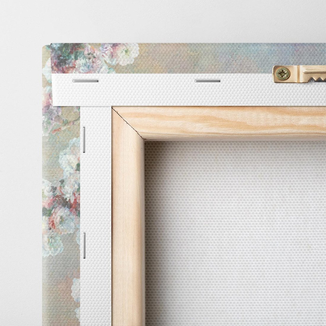Ten subtelny obraz olejny przedstawia minimalistyczny układ, gdzie kwiaty delikatnie ukazują się w rogach pastelowego tła. To wyraz subtelności i spokoju, gdzie rośliny wiodą nas przez sielski krajobraz natury, pozostawiając główną rolę ich pięknu.