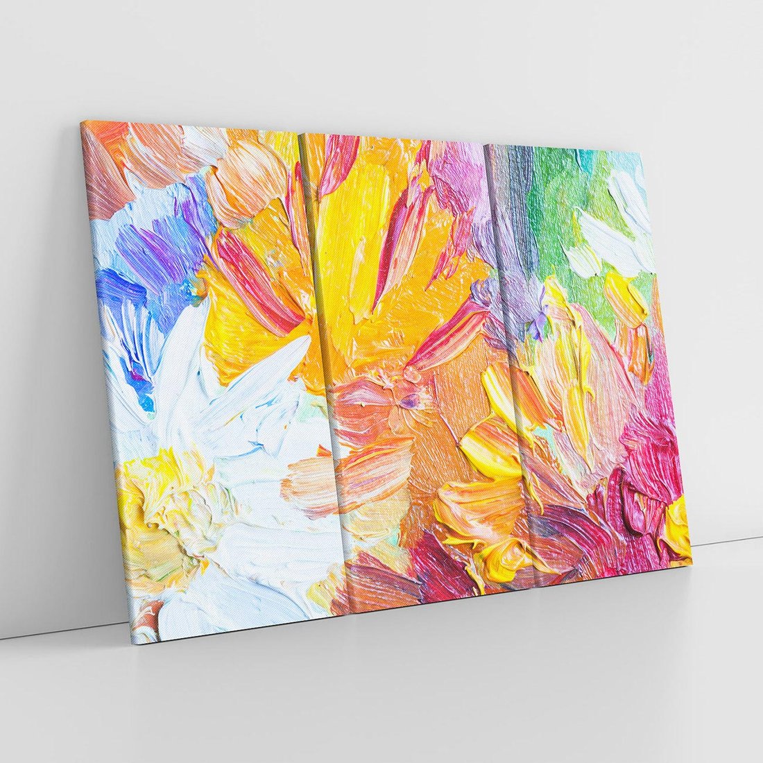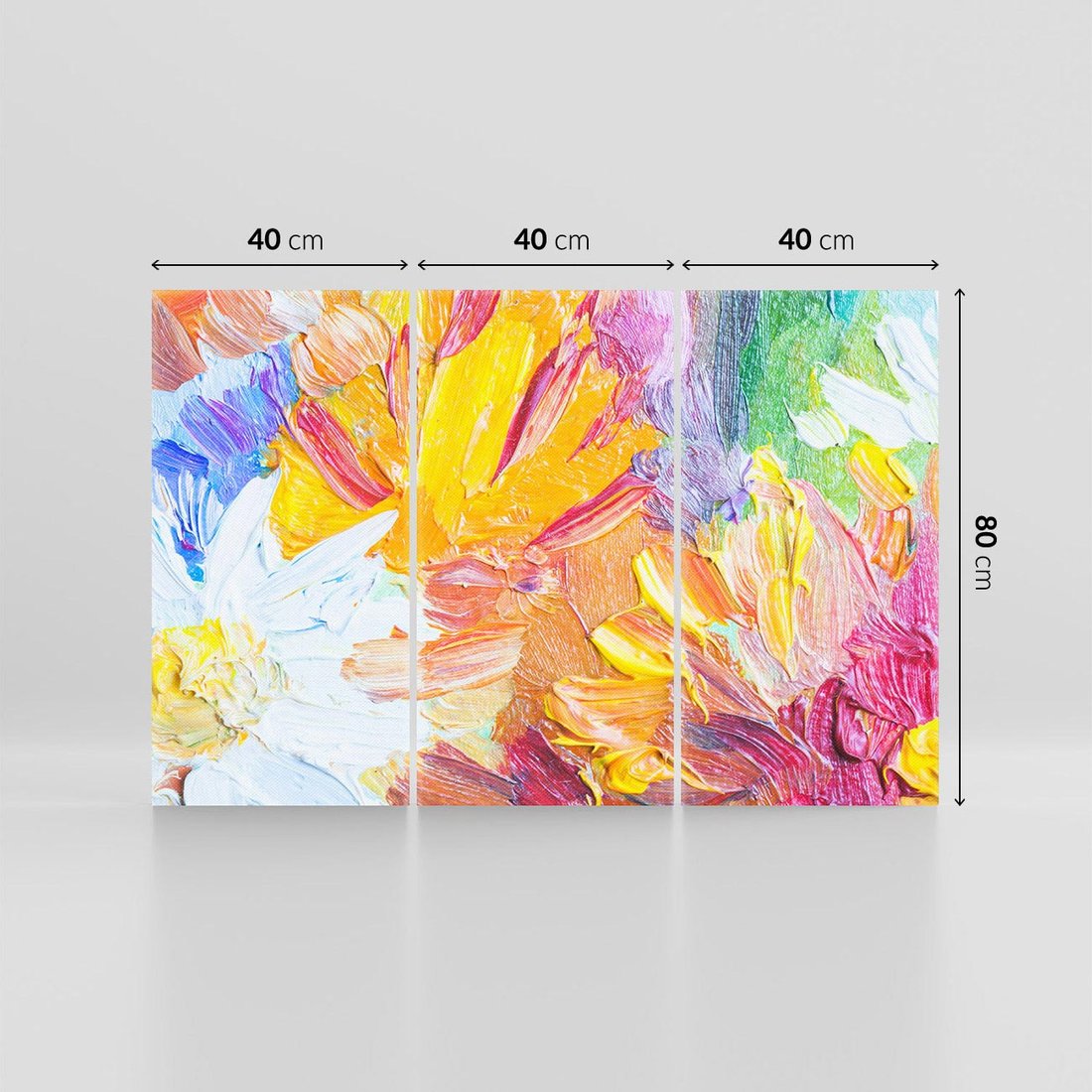 To dynamiczne zbliżenie na obraz olejny ukazuje malowane kwiaty o żywych, tęczowych kolorach. Gruba warstwa farby nadaje kompozycji teksturę i głębię. "Kwiatowe Harmonie" to eksplozja optymizmu i radości, gdzie artysta przenosi widza w magiczny świat pełen barw i życia, celebrując piękno natury.
