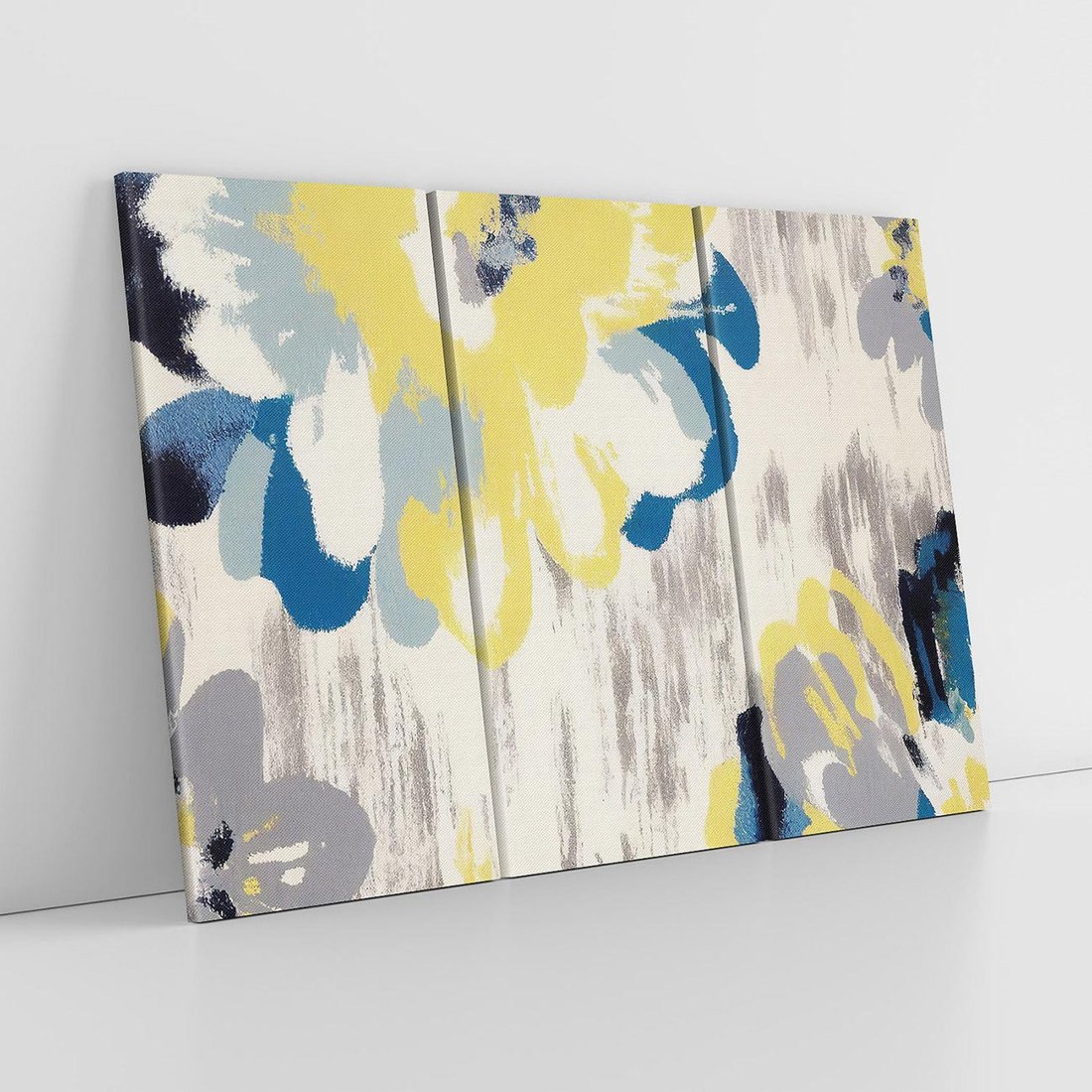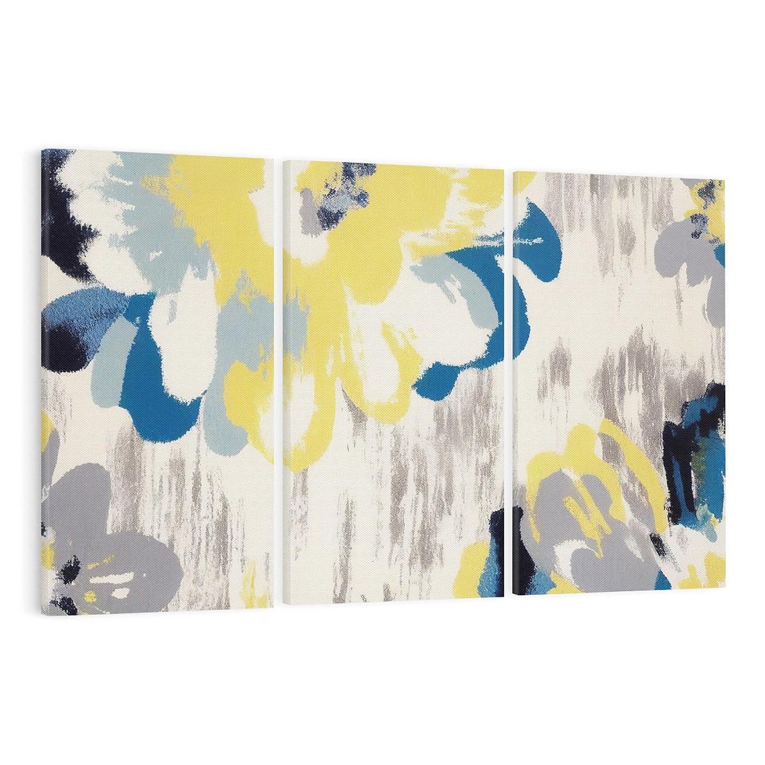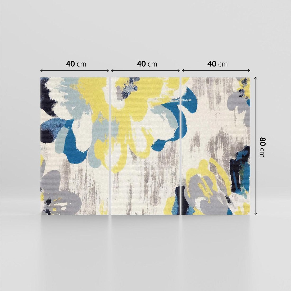 Zachwycający obraz z malowanymi dużymi kwiatami w kolorach żółtym, niebieskim i szarym. Abstrakcyjne kompozycje wprowadzą harmonię natury do Twojego wnętrza.