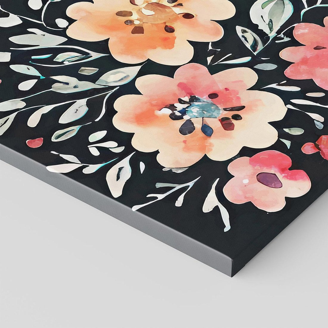Ten obraz przedstawia akwarelowe, pastelowe kwiaty, które ożywają na tle głębokiej czerni. Kontrast między jasnymi, delikatnymi kolorami kwiatów a ciemnym tłem tworzy efektowne wrażenie. To połączenie subtelnego piękna kwiatów z tajemniczym i intrygującym tłem tworzy niezwykłą atmosferę.
