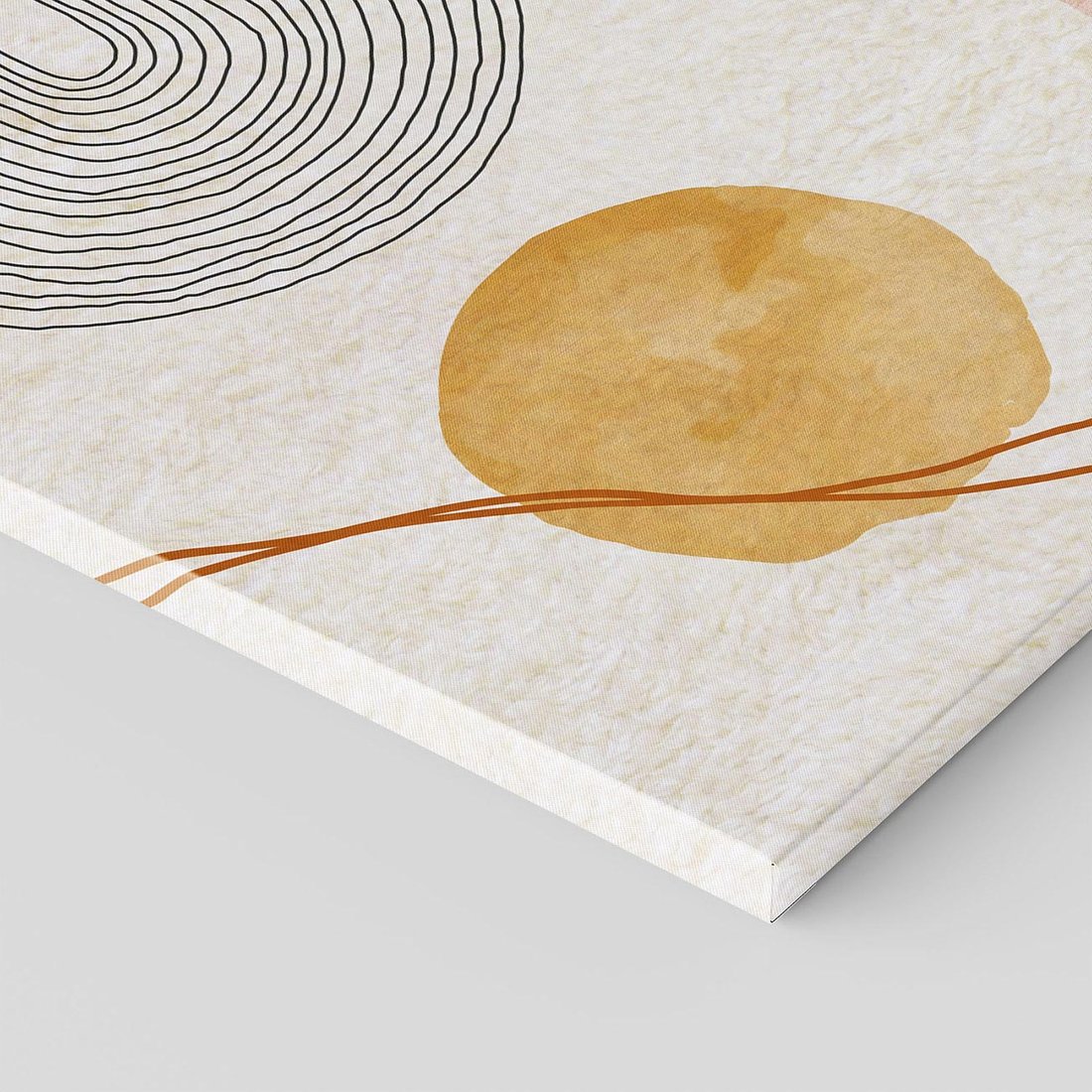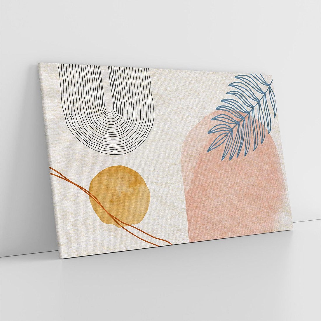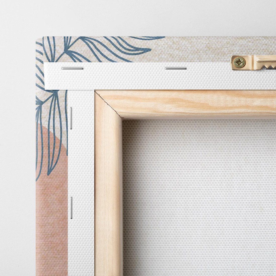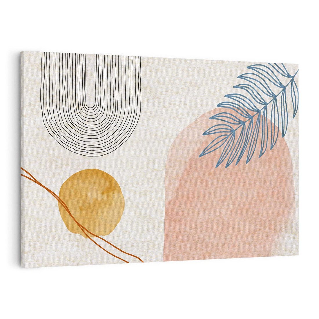 To nowoczesne dzieło sztuki łączy akwarelowe plamy z geometrycznymi kształtami liści palmowych. Delikatne pastelowe kolory dodają mu subtelności i elegancji. Obraz przynosi świeżość natury do wnętrza, nadając mu artystyczny charakter. Doskonały akcent do nowoczesnych aranżacji.
