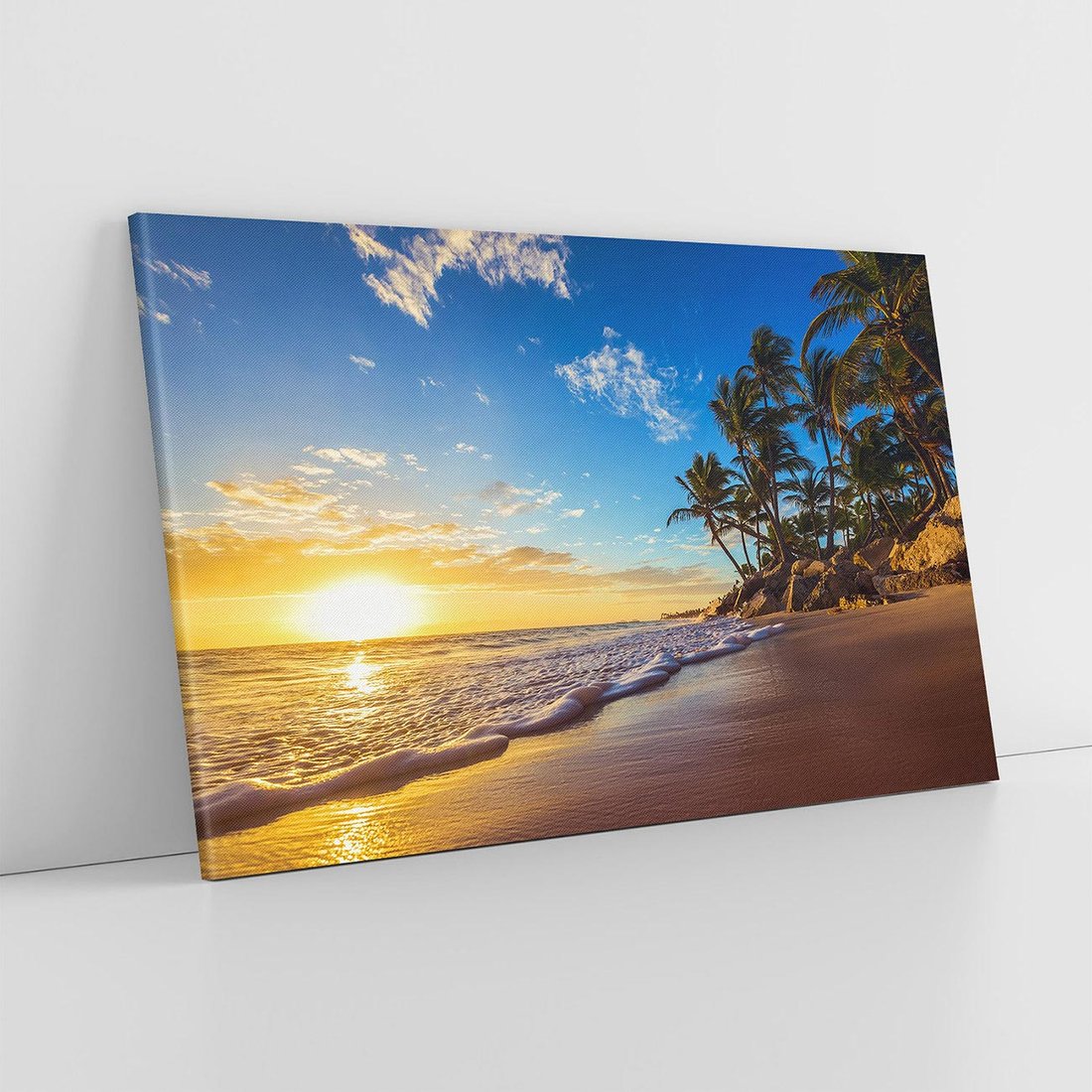 Odkryj magię zachodu słońca na rajskiej plaży dzięki temu malowniczemu obrazowi. Ciepłe kolory, palmowe drzewa i migotliwe fale tworzą romantyczną atmosferę. Ta kompozycja dodaje wakacyjnego klimatu i nostalgii, idealna dla osób pragnących poczuć atmosferę tropików i błogiego wypoczynku na plaży.