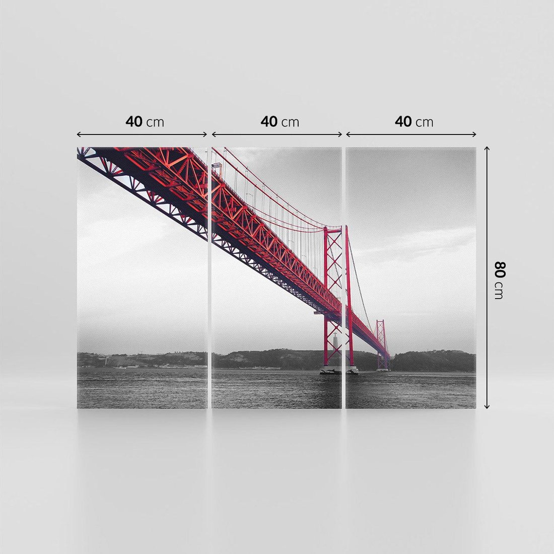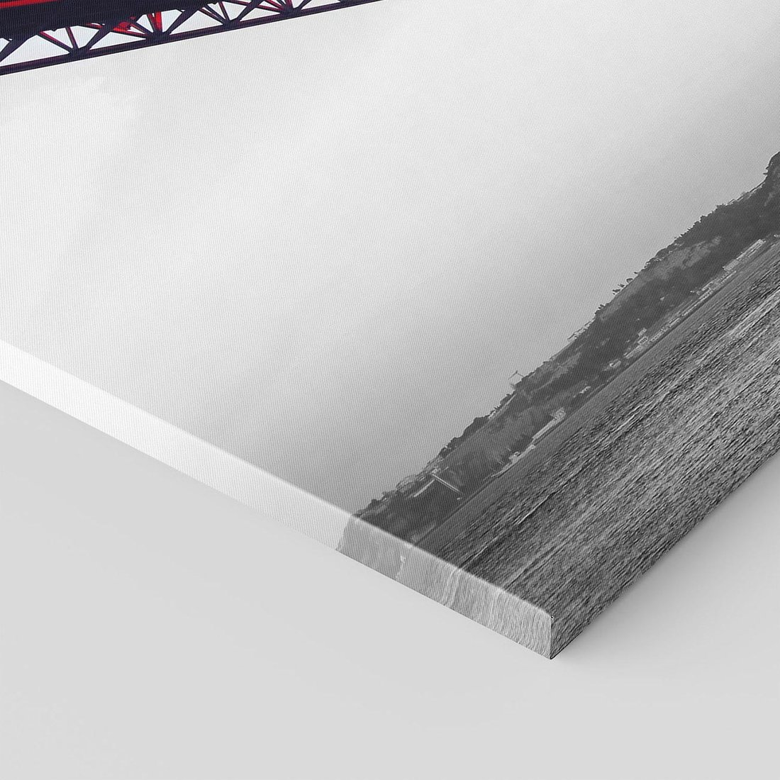 Ta czarno-biała fotografia ukazuje majestatyczny obraz czerwonego, stalowego mostu rozpostartego ponad rzeką. Jego imponujący i ogromny kształt kontrastuje z delikatnymi odcieniami szarości wokół, dodając mu siły i wyrazu. Widok ten zachwyca swoją potęgą i elegancją, oddając ducha architektury w harmonii z naturą.