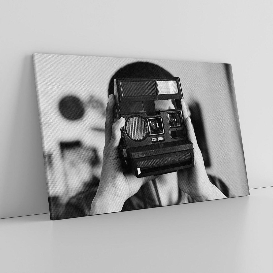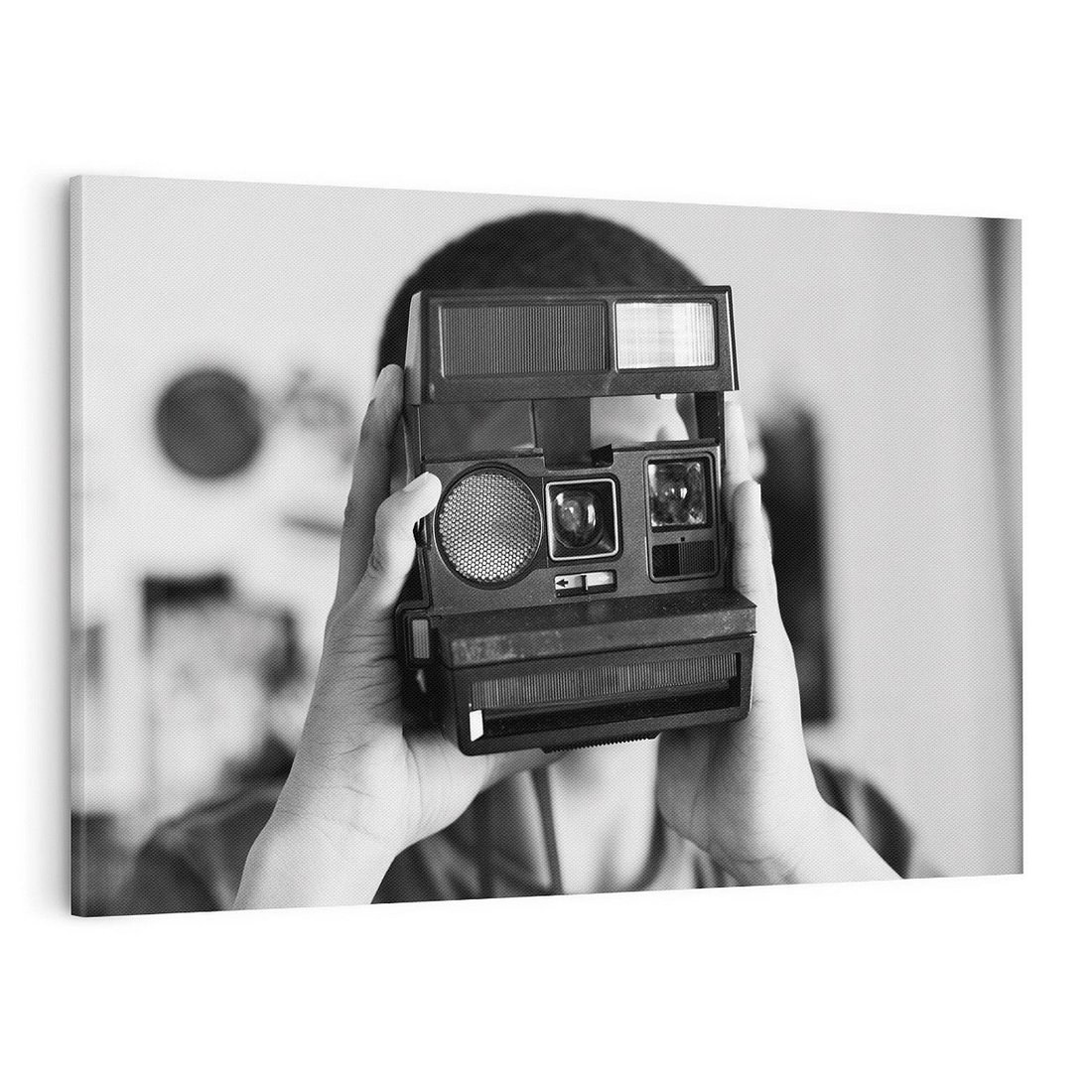 Czarno-biały portret przedstawia mężczyznę, który robi zdjęcie, używając polaroidu. Fotografia emanuje artystycznym wdziękiem, a klimat retro dodaje jej wyjątkowego charakteru. Ten obraz przenosi nas w świat sztuki i fotografii, wzbudzając zainteresowanie i ciekawość. Idealny dodatek do wnętrz, które pragną zachować artystyczną duszę.