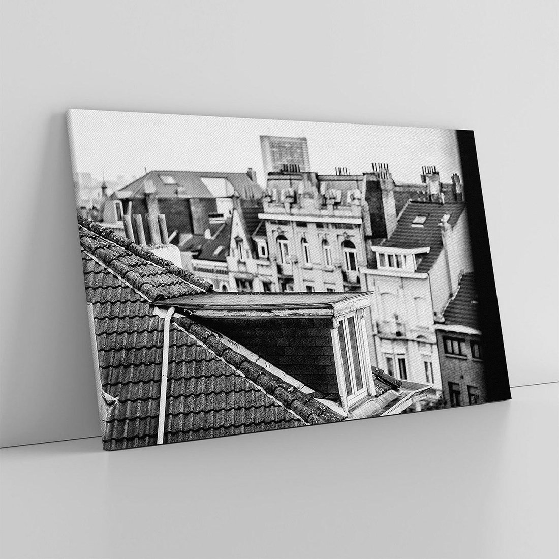 Ta czarno-biała fotografia przedstawia malowniczy widok na dachy wielkiego miasta, gdzie stare kamienice tworzą charakterystyczną atmosferę. Ujęcie przenosi nas w czasie do retro epoki, gdzie miasto emanuje swoją historyczną duszą. Zdjęcie wyraża urok staroświeckiego miasta, które zachwyca swoją niepowtarzalną aurą.