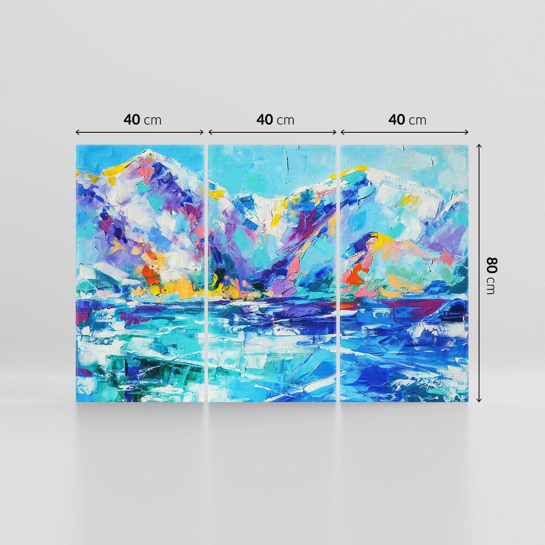 Abstrakcyjny pejzaż górskich szczytów w doskonałym harmonijnym tańcu. Odważne połączenia kolorów – głęboki błękit, ciepła żółć i tajemniczy fiolet – malowane techniką olejną. Ten niezwykły obraz wprowadzi magiczny nastrój do Twojego wnętrza, tworząc most pomiędzy rzeczywistością a abstrakcją.