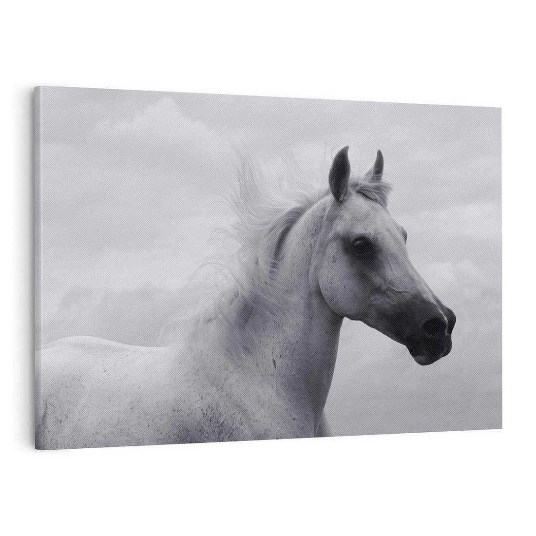 Ta czarno-biała fotografia ukazuje piękną i majestatyczną postać konia - białego z siwym umaszczeniem. Jego rozwiana grzywa i dumne spojrzenie dodają mu charakteru. Tło z przepięknymi chmurami podkreśla harmonię i siłę natury. To obraz oddający potęgę i wolność zwierzęcia, zachwycający swoją prostotą i pięknem.