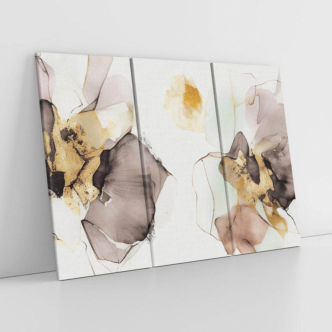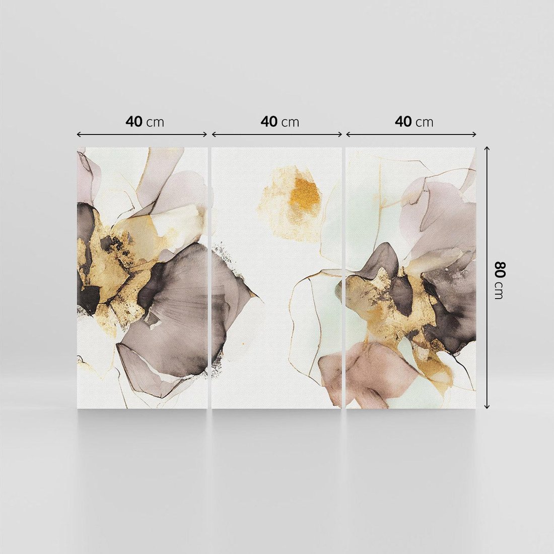 Odkryj elegancję w tym akwarelowym dziele sztuki, gdzie złote linie i plamy harmonijnie współgrają z beżowymi i brązowymi odcieniami. Doskonałe dopasowanie do nowoczesnego wnętrza.