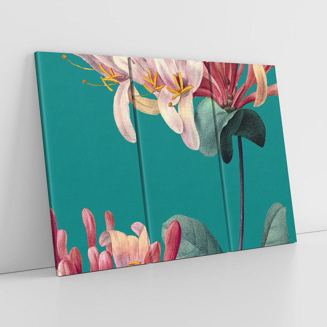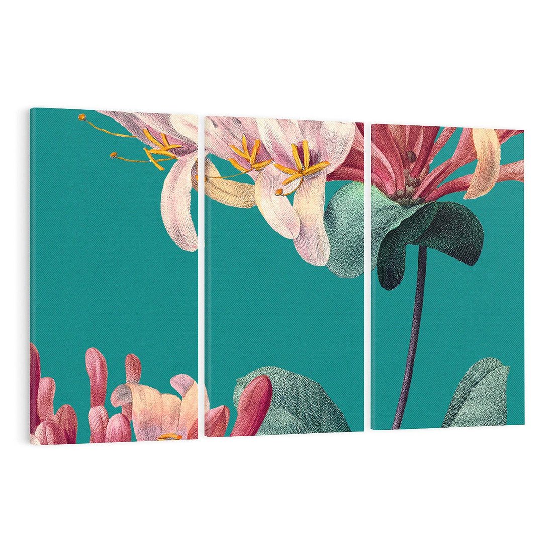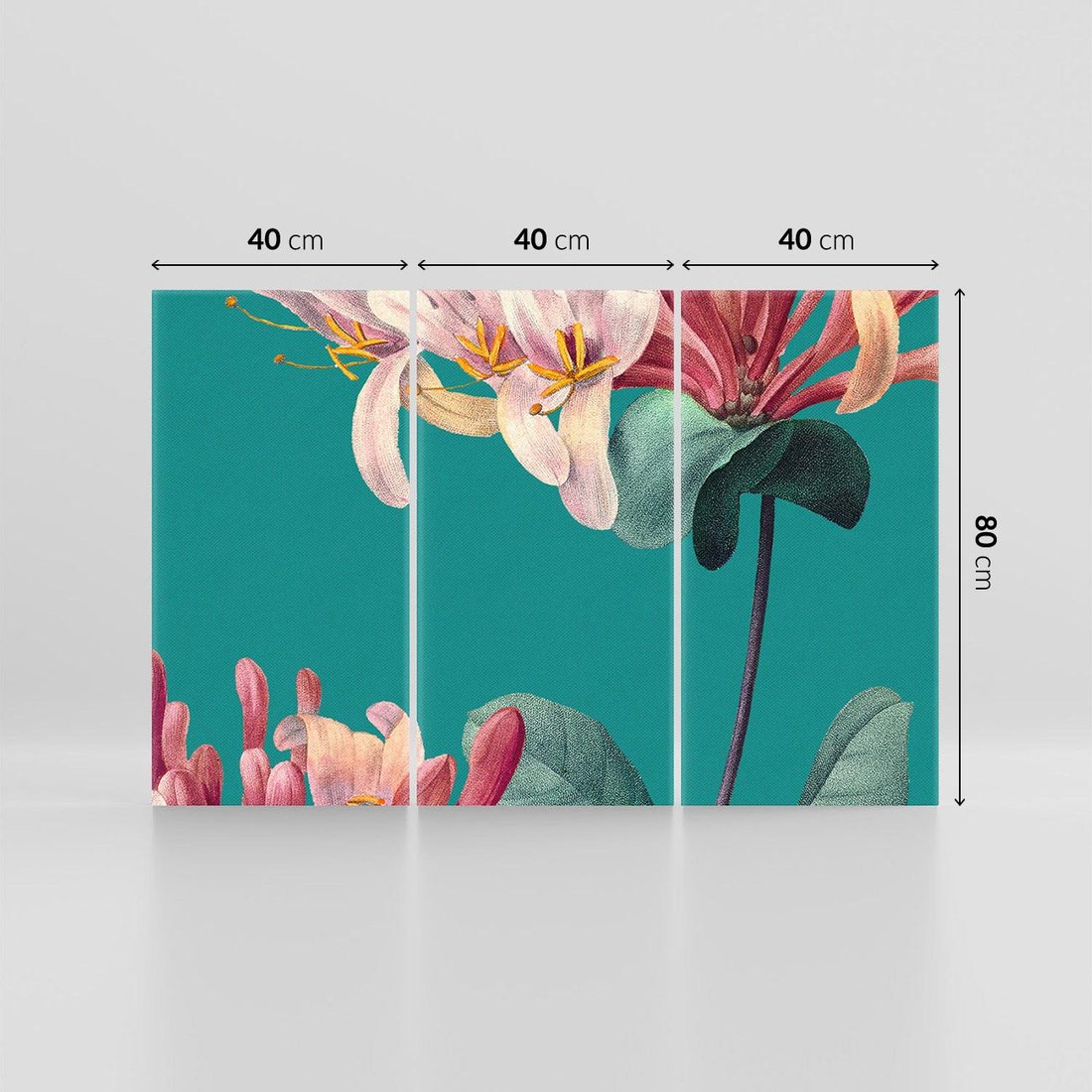 Wielkoformatowa grafika w stylu vintage ukazuje mistyczne zbliżenie na kwiaty, które unoszą się na tle w morksim kolorze. To magiczne połączenie natury i nostalgii, gdzie delikatne kwiaty pokazują wszystkie swoje detale. To harmonijne wyrażenie siły natury i subtelności kwiatowej elegancji.