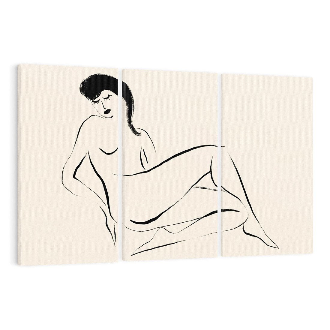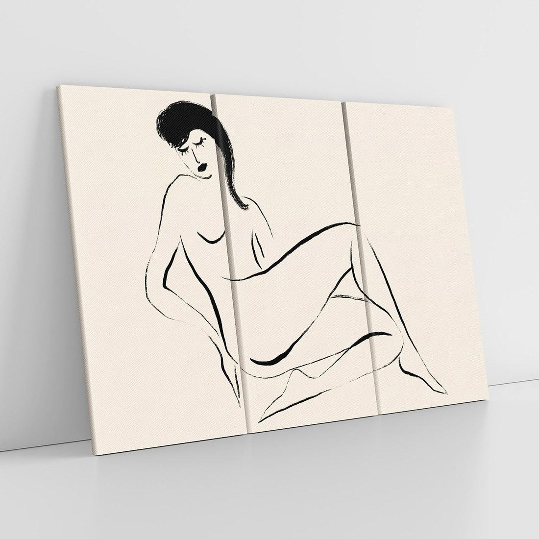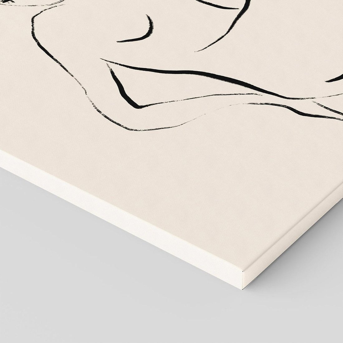 Ten abstrakcyjny rysunek w czarno-białym stylu namalowany minimalistyczną kreską przedstawia nagą kobietę. Delikatne linie podkreślają jej piękno i subtelność, jednocześnie pozostawiając miejsce na wyobraźnię i interpretację. To dzieło sztuki emanuje prostotą, jednocześnie ukazując głębię i wyrazistość ludzkiej formy.