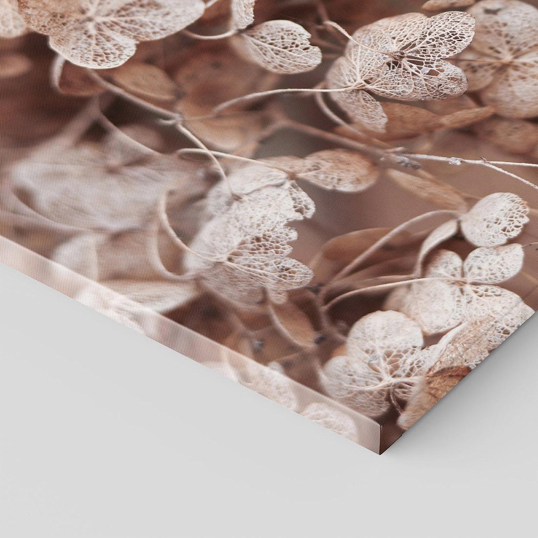 To ujęcie makro przedstawia zasuszone kwiaty w delikatnych beżowych odcieniach, które ukazują subtelność i urok przemijającej natury. Fotografia skupia się na drobnych detalach, ukazując piękno i delikatność nawet w procesie starzenia się roślin. Obraz zachwyca unikalnym pięknem i przypomina o ulotności życia oraz niezwykłej harmonii natury.
