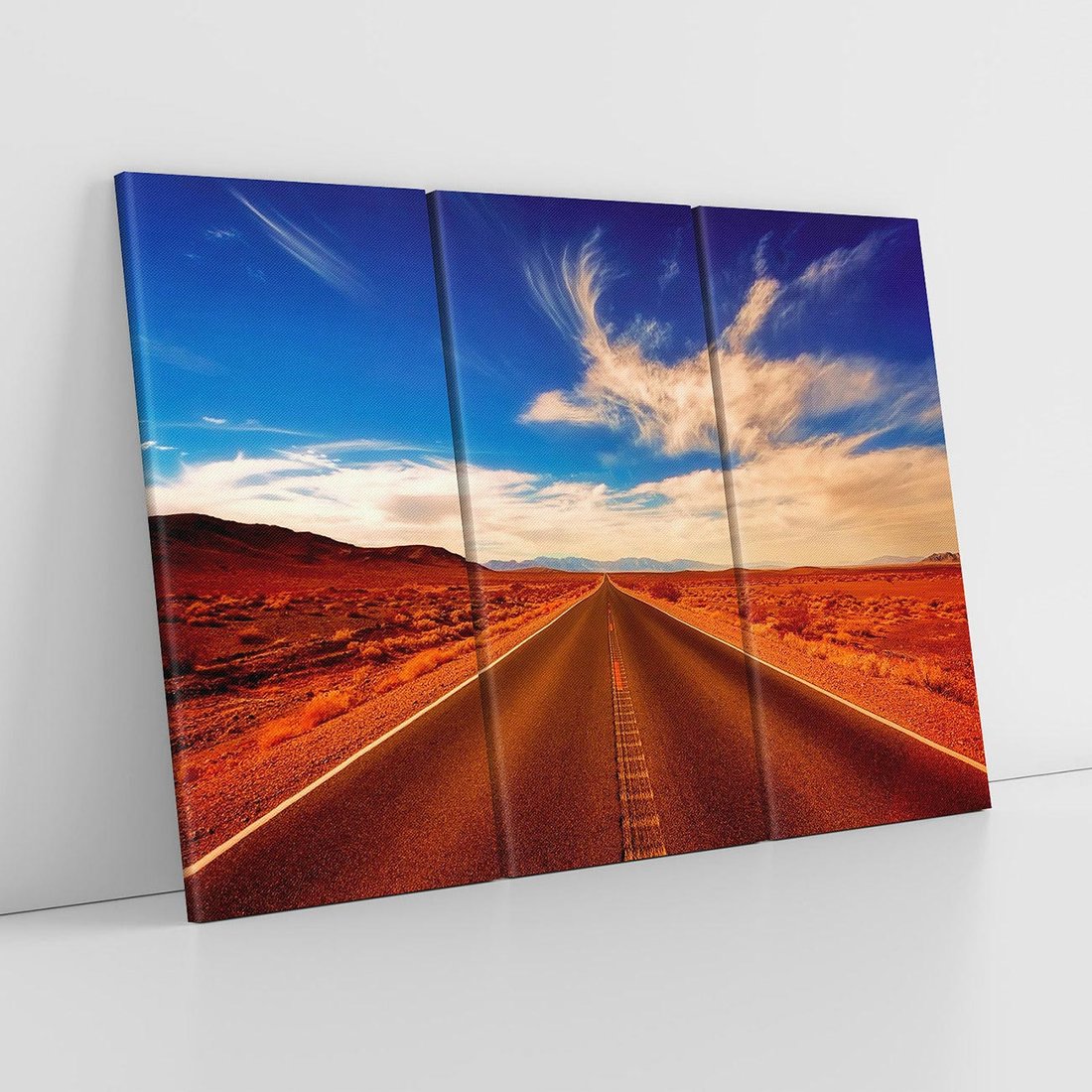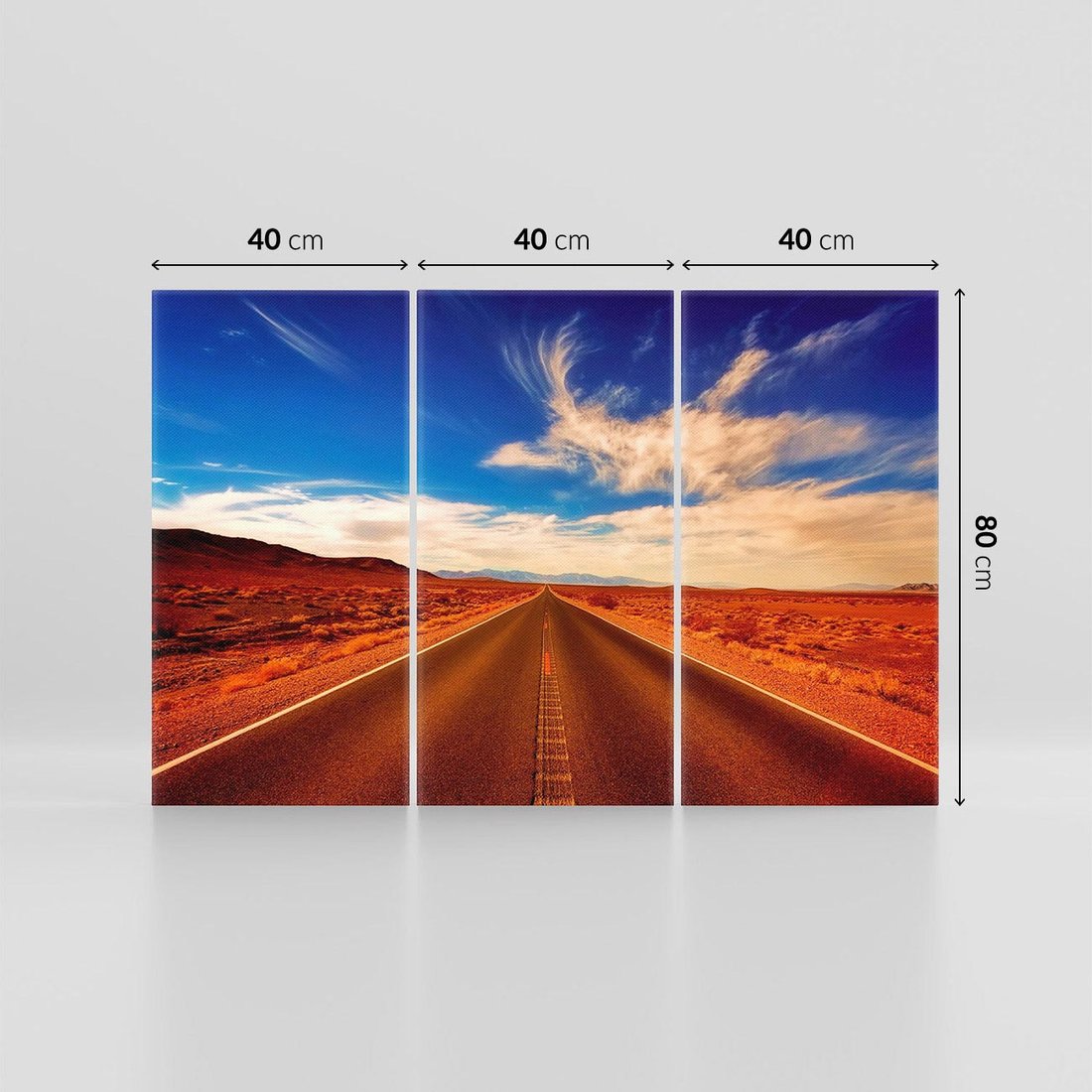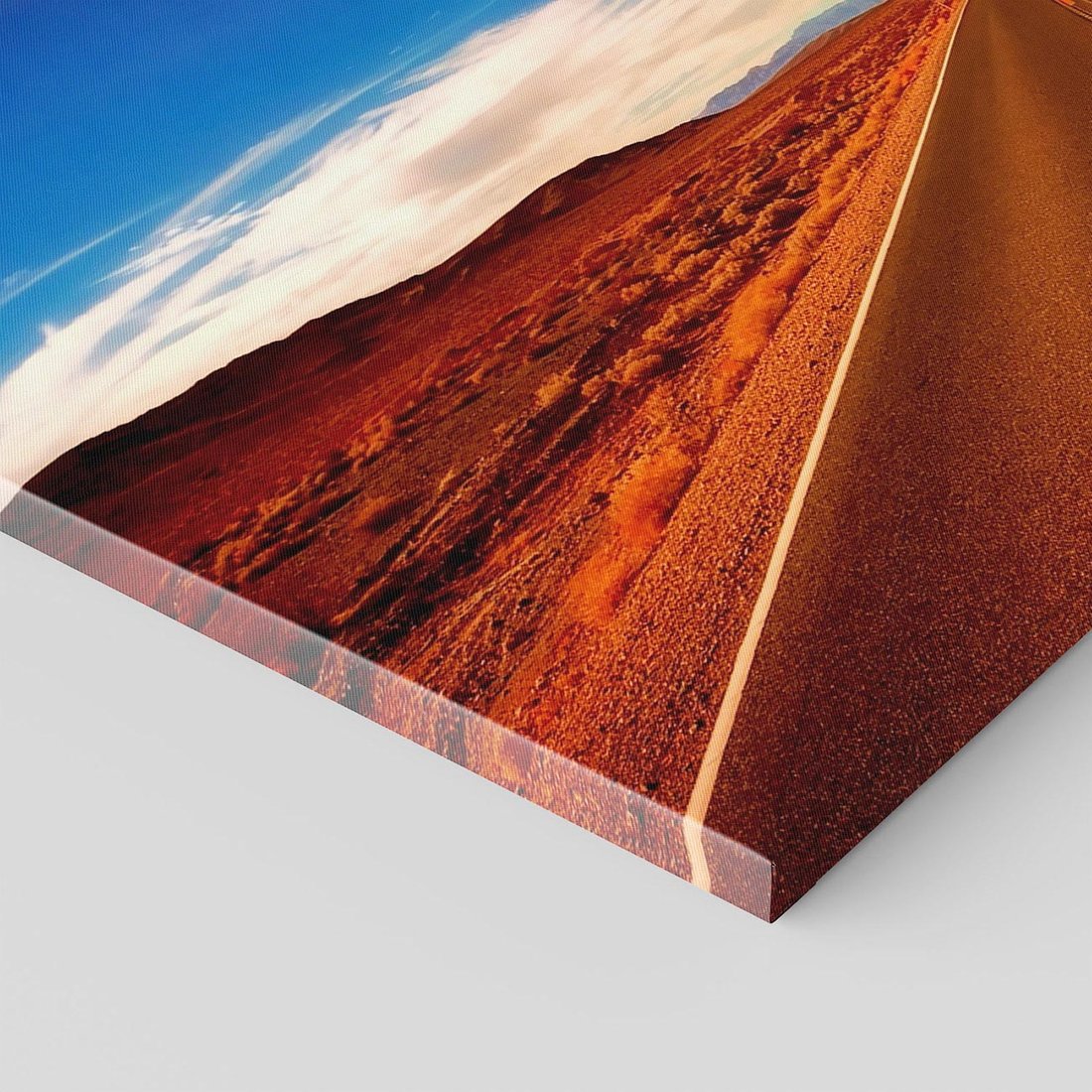 Obraz na płótnie przedstawiający malowniczą drogę prowadzącą przez pustynię. Ta dynamiczna kompozycja przyniesie do wnętrza energię i pasję podróży.