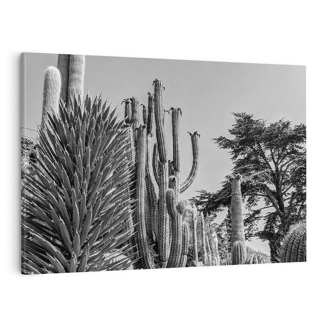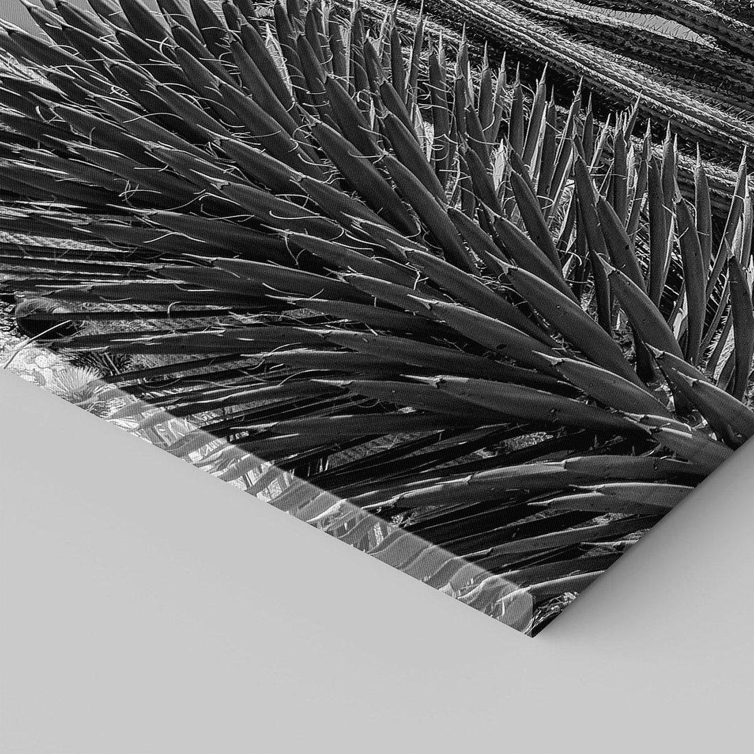 To czarno-białe zdjęcie ukazuje surową piękność pustyni, gdzie wydźwięk kontrastujących odcieni czerni i bieli podkreśla jej dzikość i spokój jednocześnie. Kaktusy, rosnące w tej niegościnnej przestrzeni, dodają kompozycji życia i symbolizują wytrwałość w trudnych warunkach. To zdjęcie emanuje spokojem i samotnością pustyni, co czyni je idealnym dodatkiem do minimalistycznych wnętrz, podkreślając urok prostoty i natury.