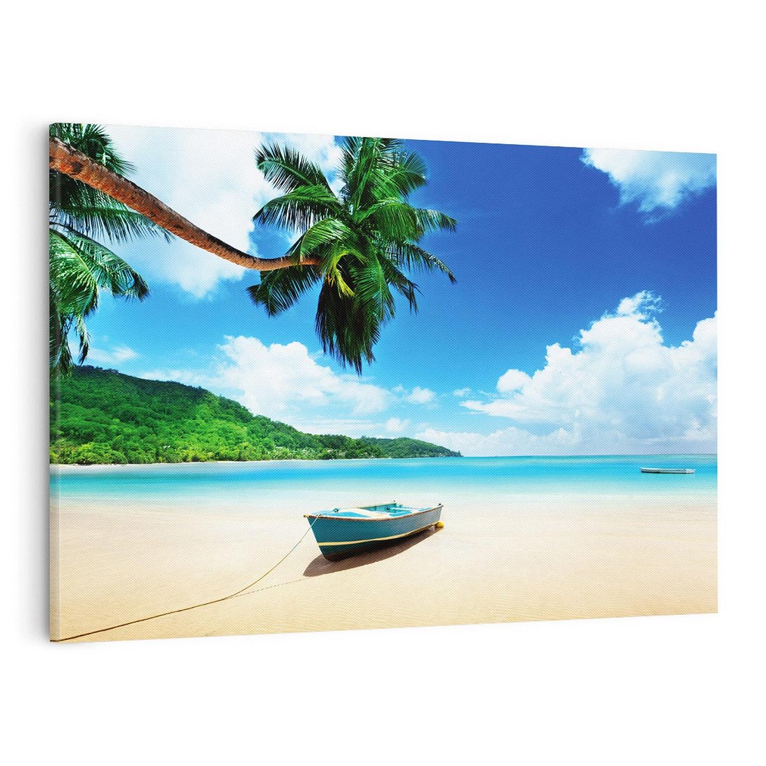 Przenieś się do rajskiej plaży dzięki temu zachwycającemu obrazowi na płótnie. Palmy, błękitny ocean i łódź tworzą idylliczną scenerię. Jego egzotyczne kolory i atmosfera letniego wypoczynku dodają relaksu i sielankowego nastroju do Twojego wnętrza.