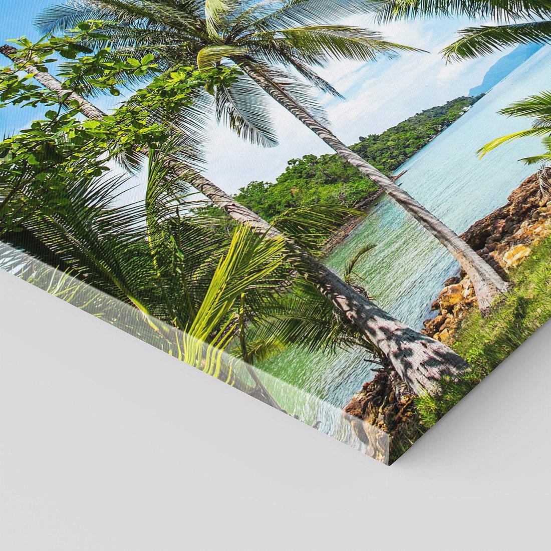 Przywołaj atmosferę rajskiej plaży dzięki temu urzekającemu obrazowi przedstawiającemu palmy nad morzem. Błękitne fale, złote plaże i bujna roślinność tworzą relaksującą atmosferę. Ta kompozycja dodaje egzotycznego uroku i wakacyjnego nastroju, idealna dla miłośników plażowych klimatów i beztroskiego wypoczynku.