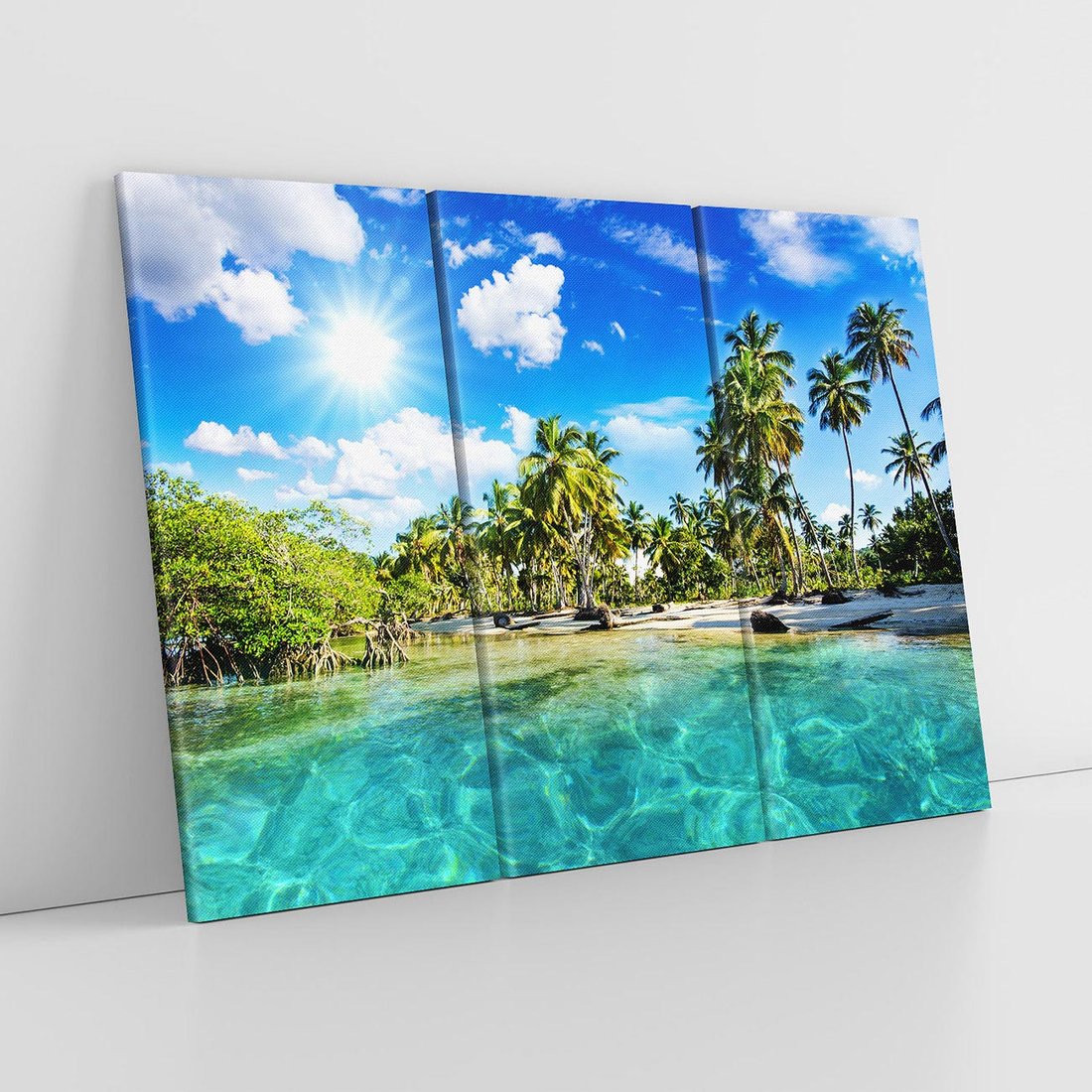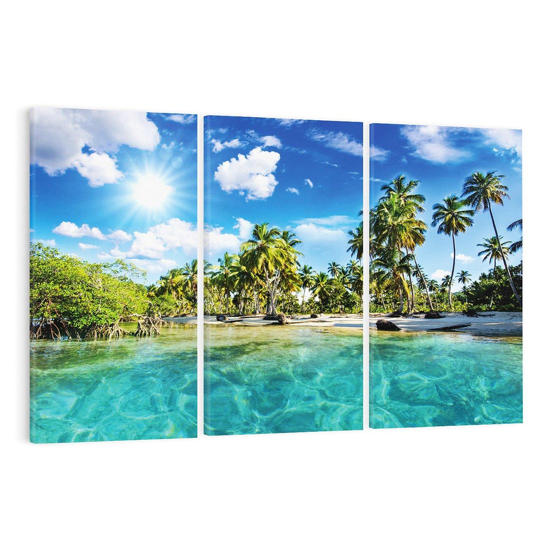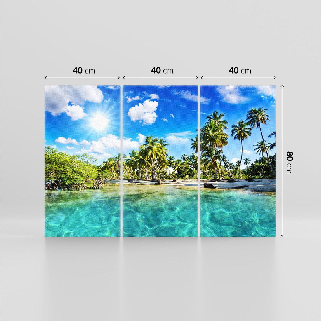 Przenieś się na rajską plażę, gdzie palmy kołyszą się na wietrze, a błękitne fale zapraszają do relaksu i wakacyjnej beztroski. Ta malownicza kompozycja przywołuje atmosferę sielskich chwil spędzonych na egzotycznej plaży.