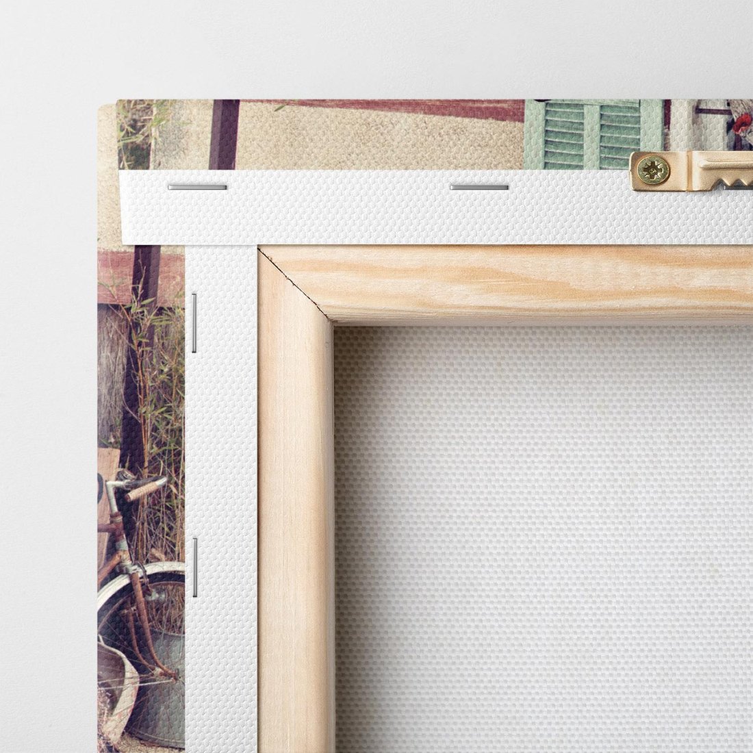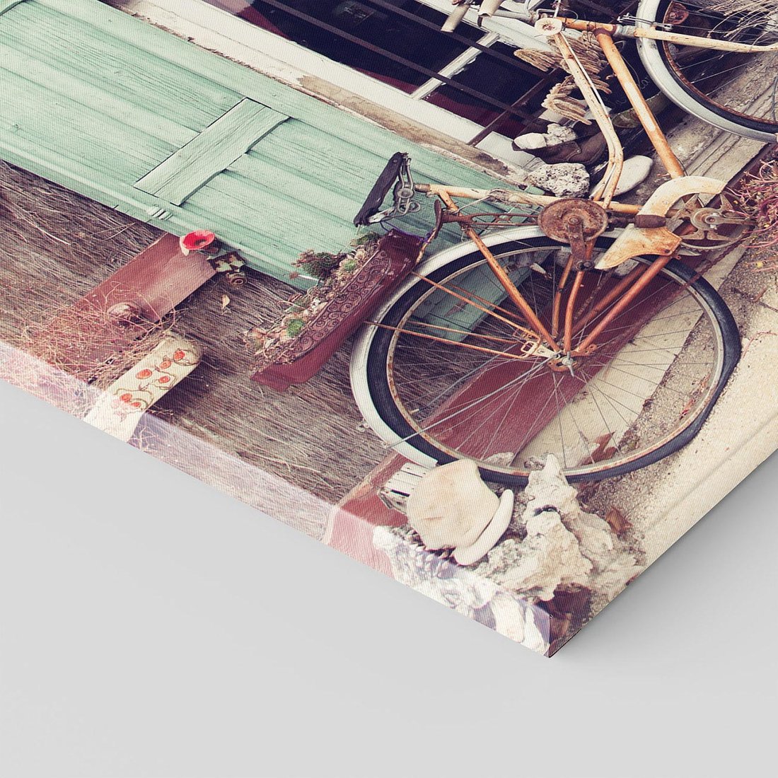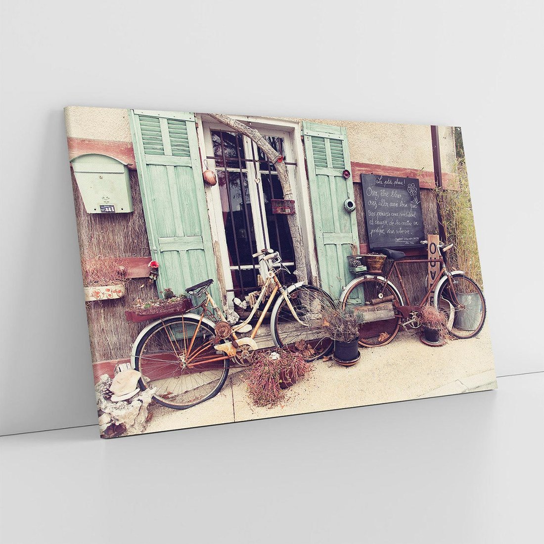 Ten malowniczy obraz na płótnie zaprasza Cię na romantyczny spacer po prowansalskich uliczkach. Rower, sklep z kwiatami i bujne pola tworzą urokliwy krajobraz. Jego pastelowe kolory i wiejski urok dodadzą sielankowego nastroju do Twojego wnętrza.