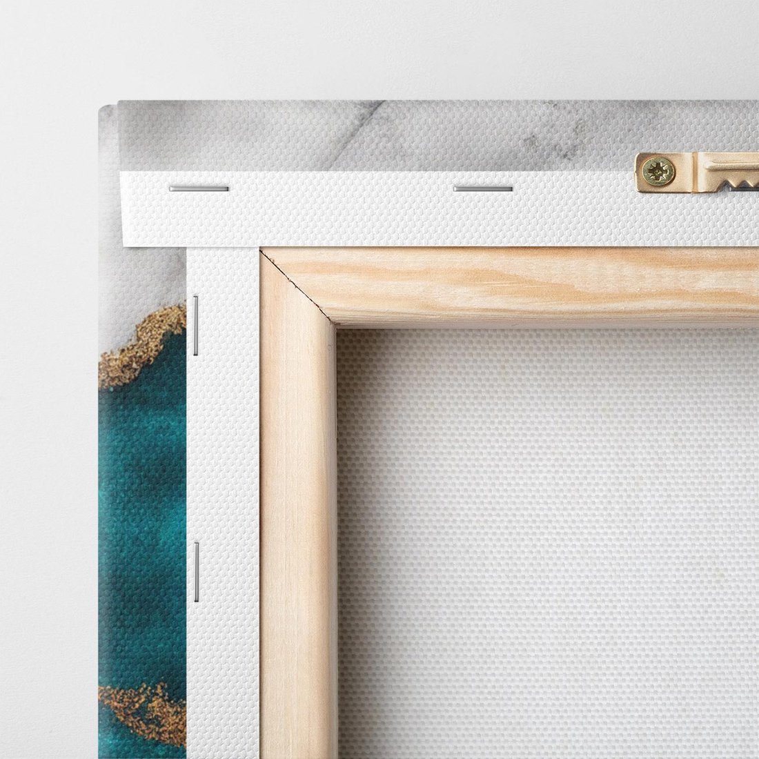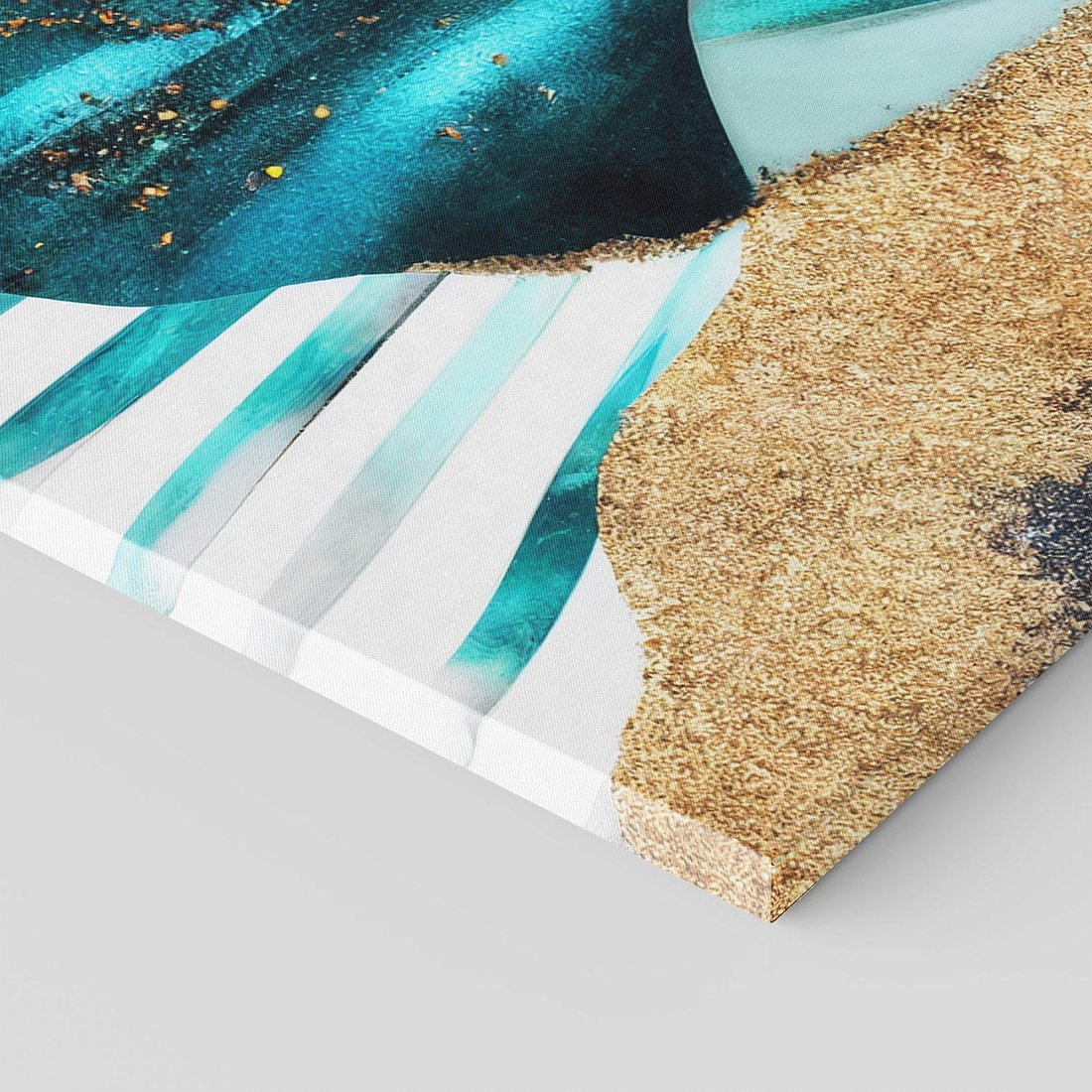 Obraz przedstawia turkusowe plamy z wplecionymi złotymi elementami, tworzące abstrakcyjną kompozycję. Rozlane farby nadają kompozycji dynamizmu i tajemniczego uroku. Obraz emanuje metaforycznym przekazem, przyciągając wzrok swoją kreatywnością i niepowtarzalnością.