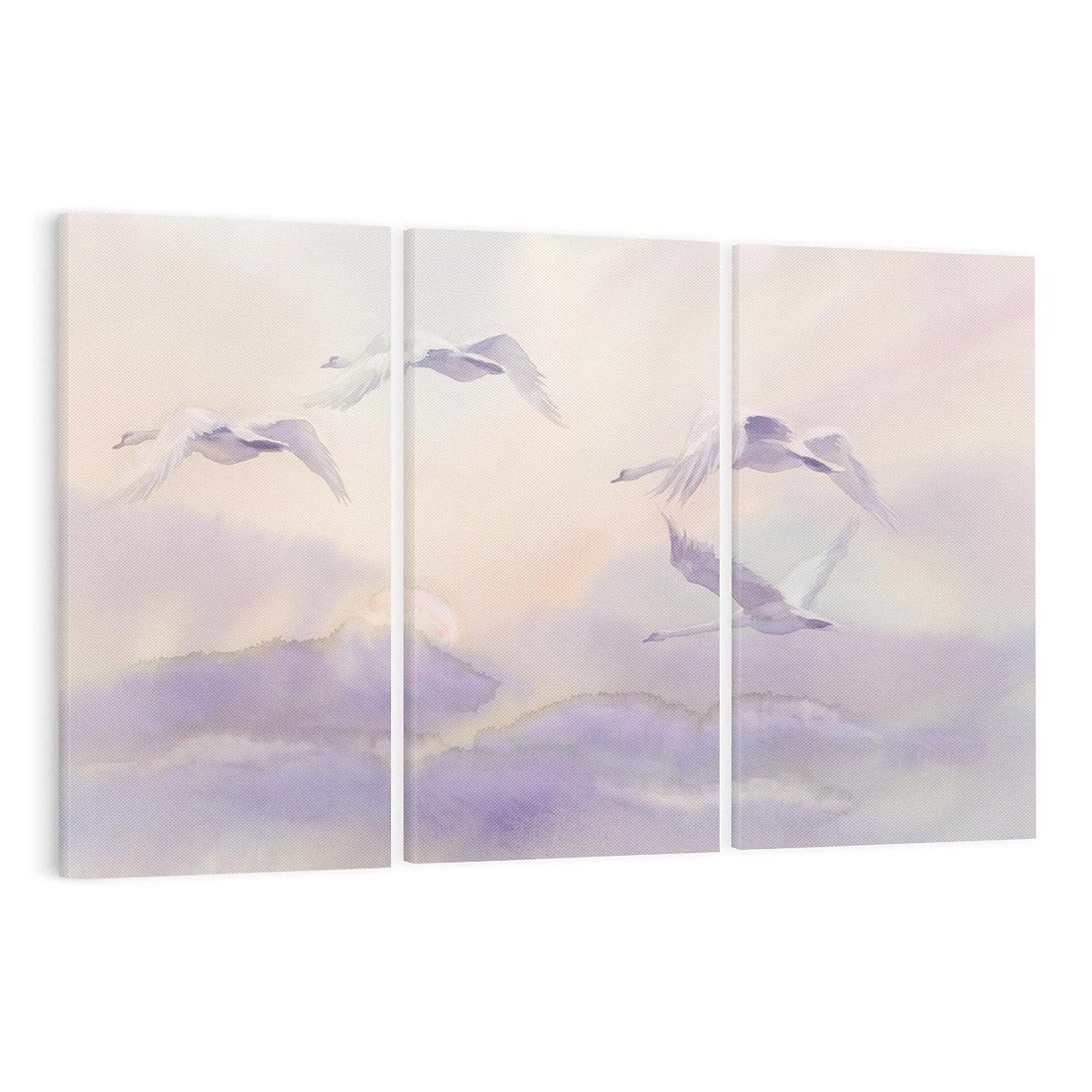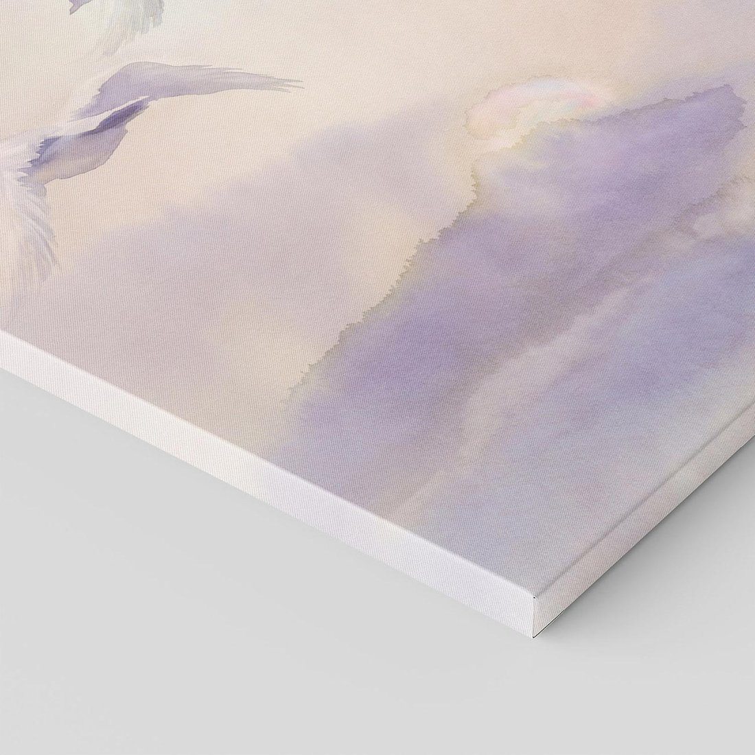 Ta akwarela ukazuje lecące białe gęsi na tle pastelowych kolorów i miękkich obłoków. Subtelne odcienie podkreślają lekkość i elegancję ich ruchów w powietrzu. To połączenie natury i spokoju, przenosi nas w chwilę pełną harmonii i piękna wśród nieba i ptaków.
