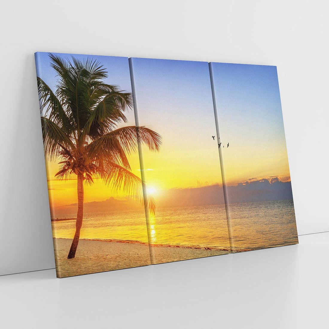 Przenieś się na rajską plażę dzięki temu romantycznemu obrazowi przedstawiającemu zachód słońca, plażę i palmy. Ciepłe kolory, złociste promienie i idylliczna sceneria tworzą nastrojową atmosferę. Ten obraz dodaje romantyzmu i spokoju, idealny dla miłośników wakacyjnego relaksu i beztroskich chwil na plaży.