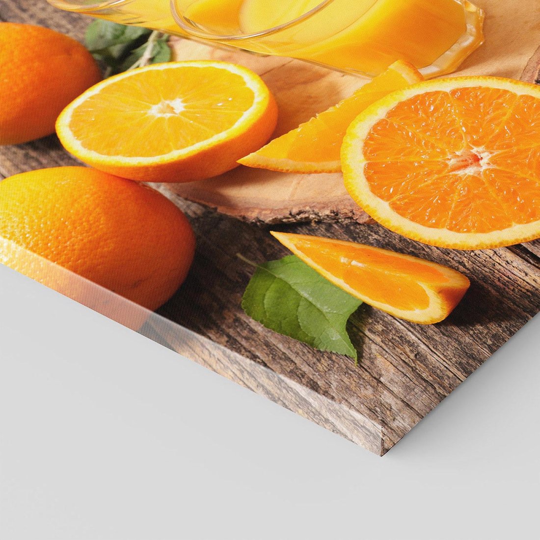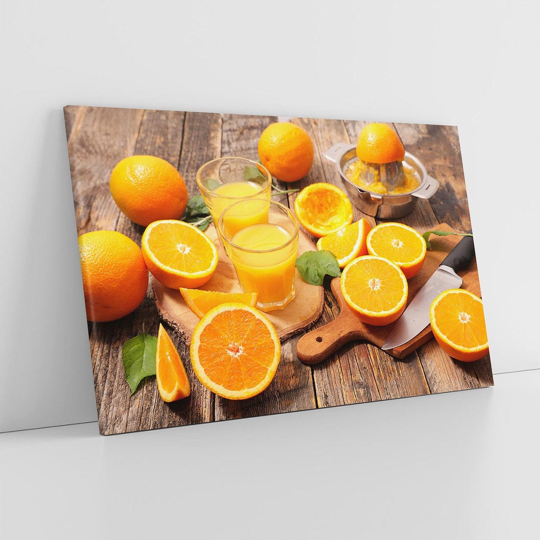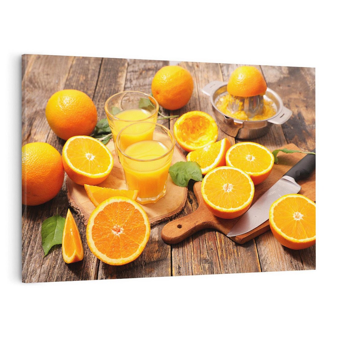 Przywołaj smakowite doznania dzięki temu uroczemu obrazowi przedstawiającemu soczyste pomarańcze i soki. Intensywny pomarańczowy kolor, soczyste owoce i szklanki z pysznymi napojami tworzą apetyczną atmosferę. Ta kompozycja dodaje radości i smakowych przyjemności, idealna dla miłośników owoców i świeżych soków.