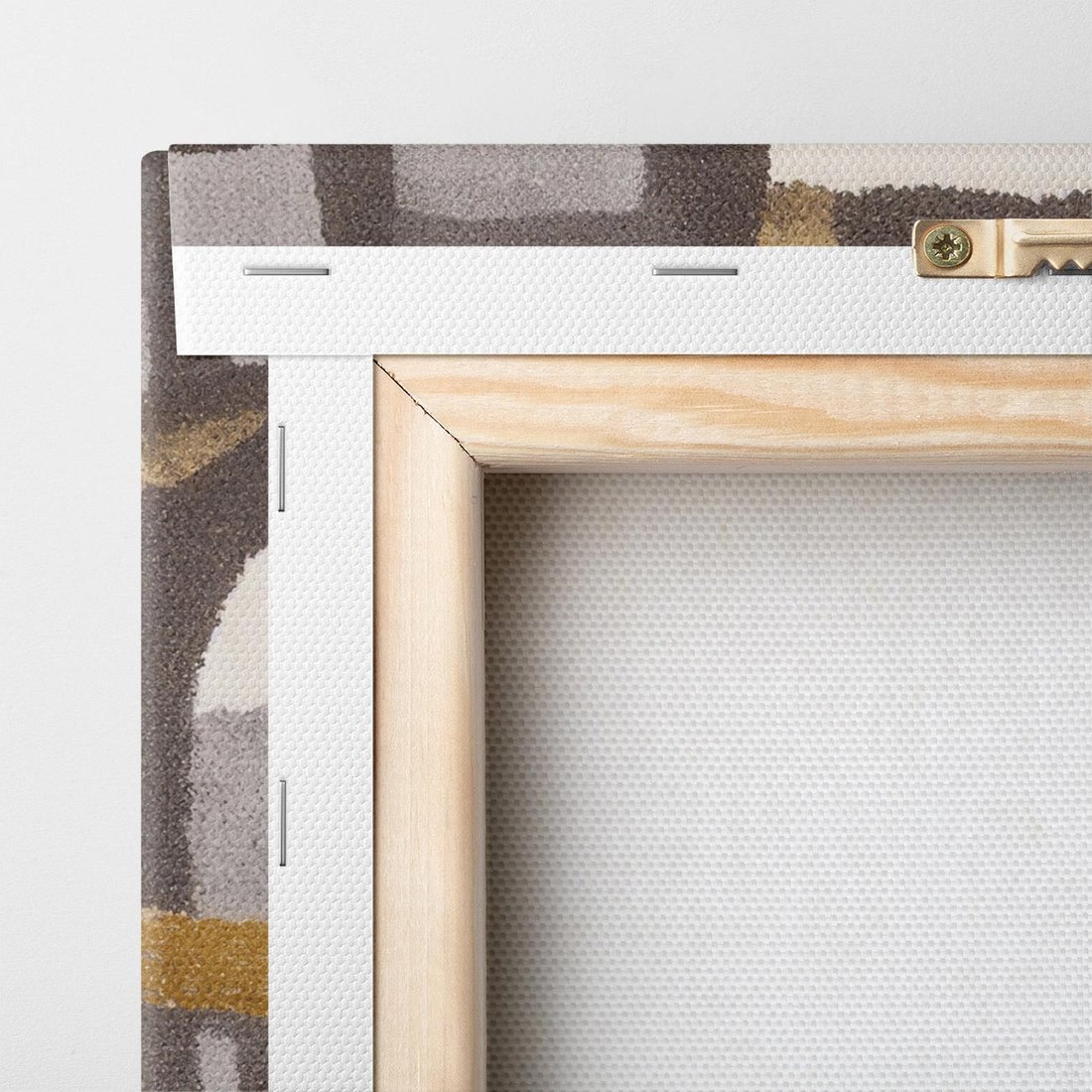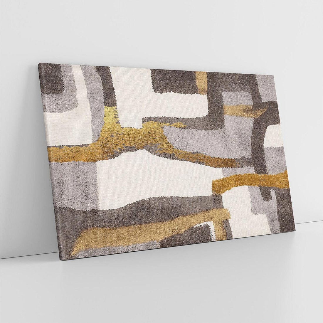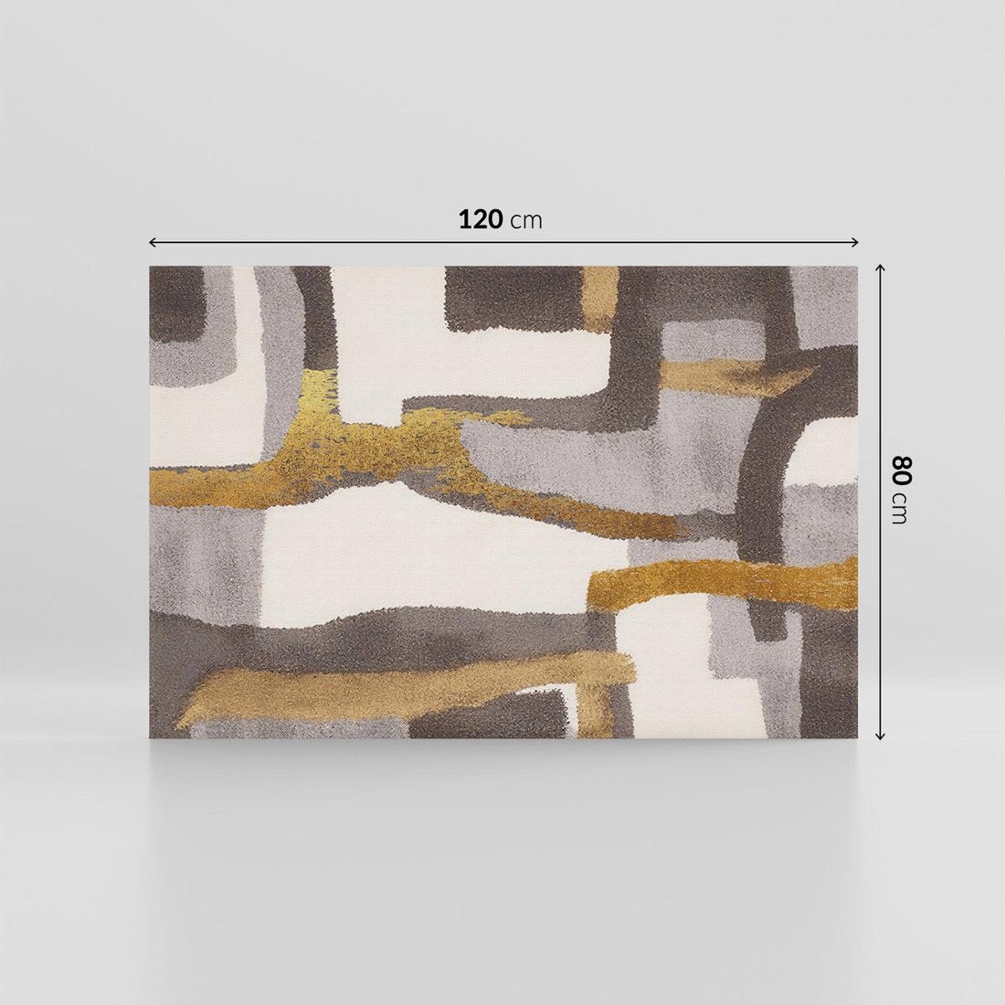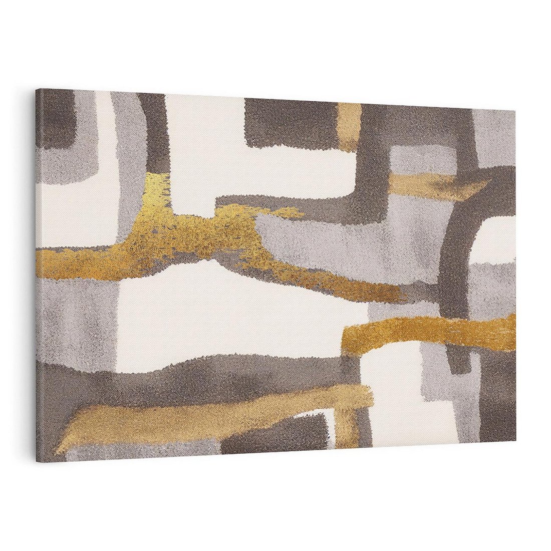 Odkryj głębię abstrakcji w tym obrazie na płótnie. Szerokie linie i złote detale są wyraźnie zarysowane na tle szarości, tworząc artystyczną wibrację, która ożywi każde pomieszczenie.