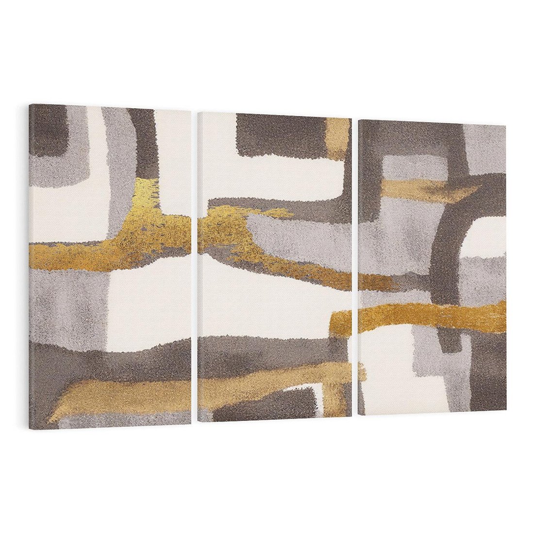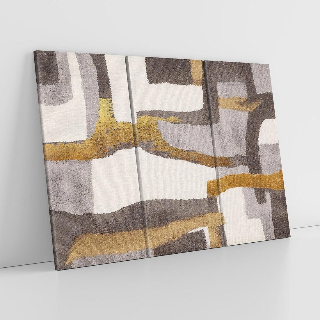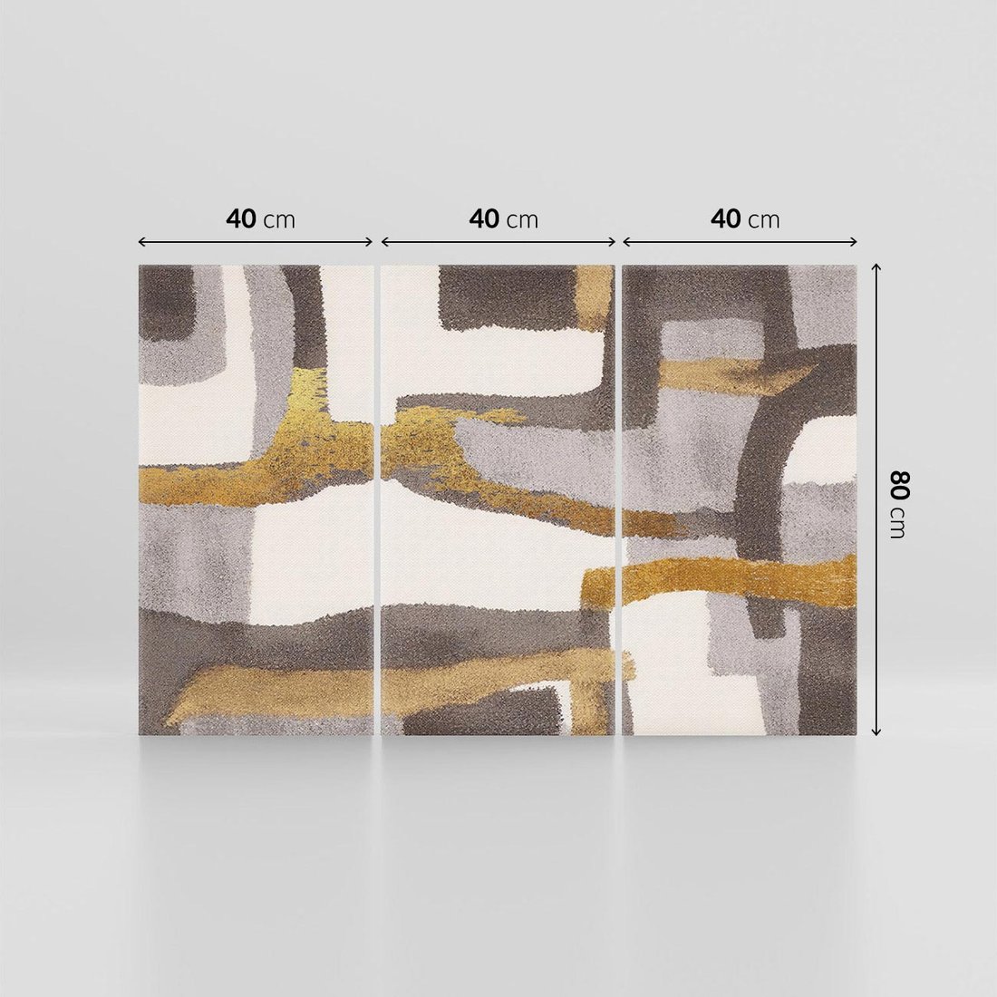 Odkryj głębię abstrakcji w tym obrazie na płótnie. Szerokie linie i złote detale są wyraźnie zarysowane na tle szarości, tworząc artystyczną wibrację, która ożywi każde pomieszczenie.
