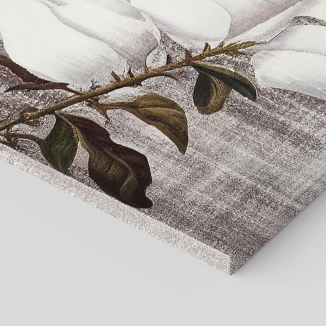 Ten wyjątkowy "obraz na płótnie" prezentuje białe kwiaty o dużych płatkach, ukazane na delikatnym szarym tle. Kanwa, na której malowano ten kwiatowy motyw, dodaje tekstury i głębi dziełu, nadając mu unikalnego charakteru. To elegancka dekoracja, która wzbogaci Twoje wnętrze o subtelny akcent natury i estetyki.