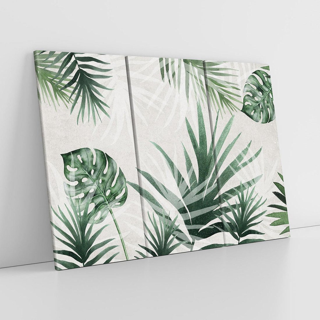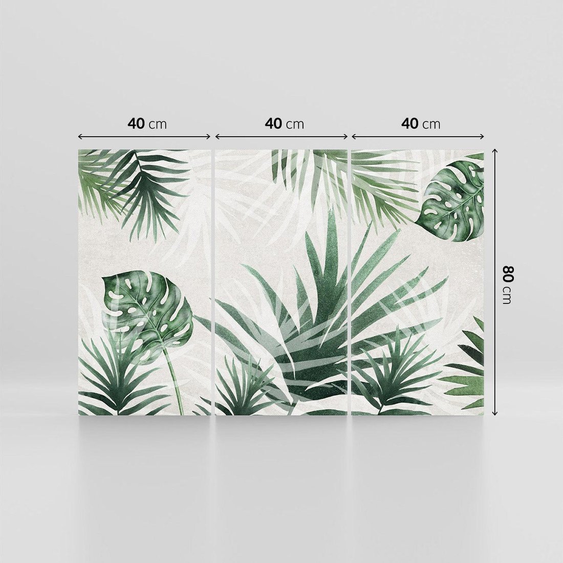 Akwarelowa kompozycja przedstawia tropikalne liście palm i monster. Delikatne odcienie zieleni kontrastują z beżowym tłem, tworząc harmonijną całość. Obraz emanuje świeżością natury i subtelnym urokiem, idealny do dekoracji wnętrz, które pragną zachować tropikalny klimat i artystyczny wdzięk.