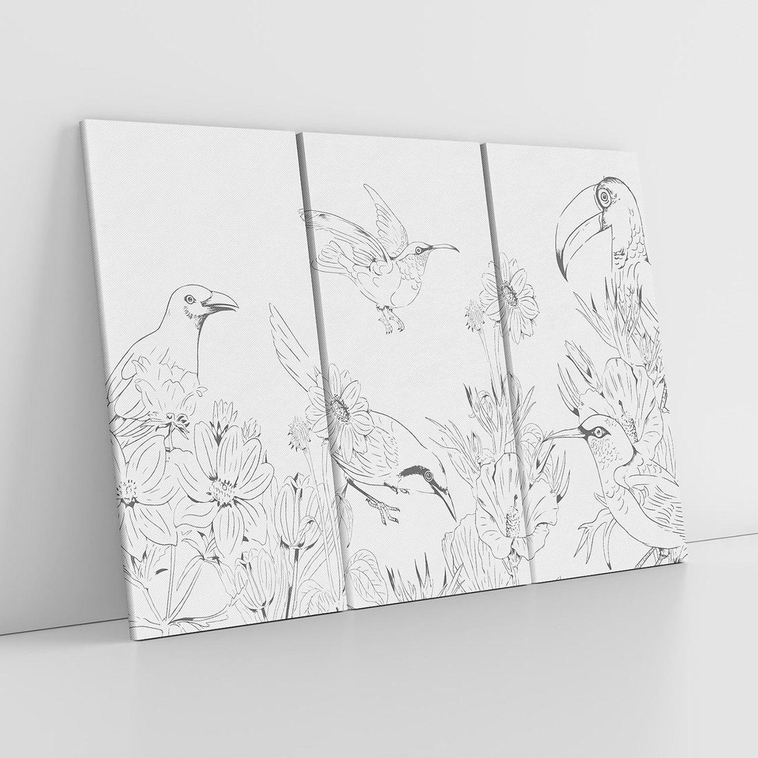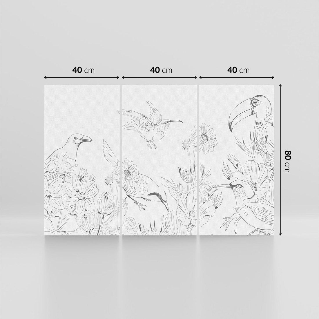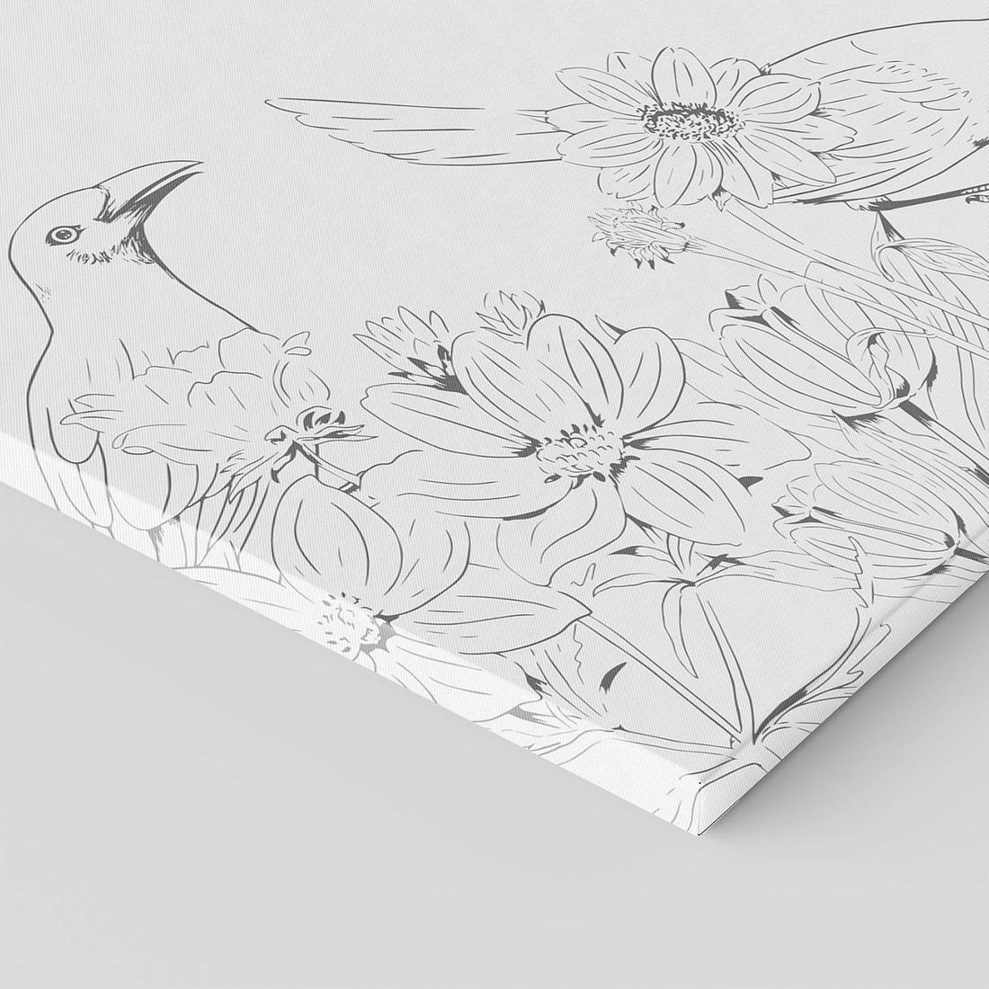 Ten czarno-biały szkic na płótnie przenosi Cię do tropikalnej dżungli, gdzie spotkasz egzotyczne ptaki, kwiaty i zwierzęta. Idealny dla miłośników monochromatycznego i klasycznego wnętrza.
