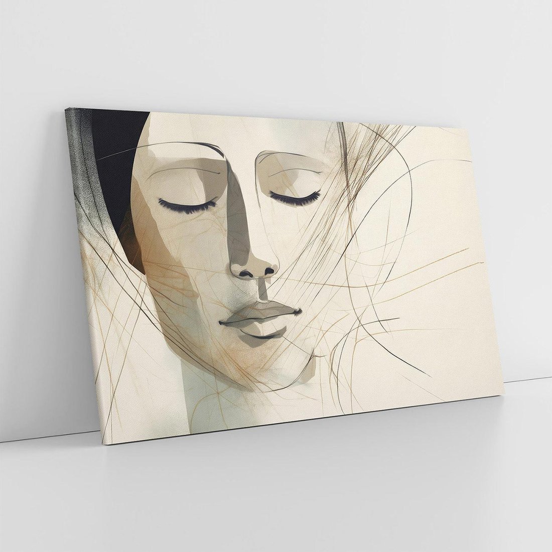 Ten obraz przedstawia twarz kobiety z zamkniętymi oczami wykonaną techniką akwareli. Szkic w neutralnych beżowych kolorach dodaje kompozycji delikatności i subtelnego piękna. Obraz emanuje spokojem i elegancją, przenosząc widza w refleksyjny nastrój. To artystyczne dzieło doskonale pasuje do nowoczesnych wnętrz, nadając im wyjątkowego charakteru.