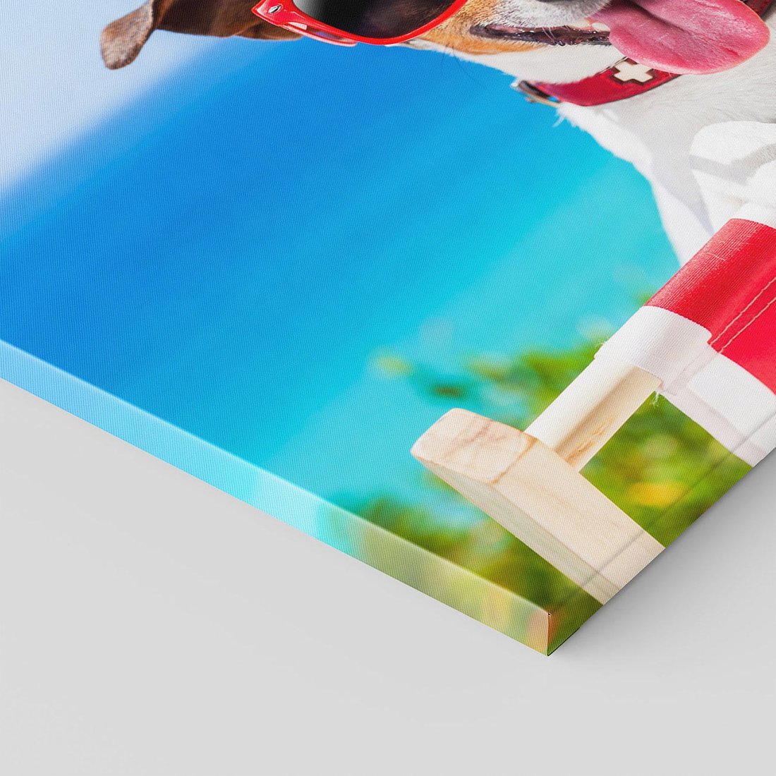Ożyw swoje wnętrze tym uroczym obrazem przedstawiającym psa w okularach na tle wakacyjnych akcesoriów. Słoneczne promienie, radosna energia i wakacyjny nastrój tworzą beztroską atmosferę. Ta kompozycja dodaje uśmiechu i radości, idealna dla miłośników zwierząt i wakacyjnych wspomnień.