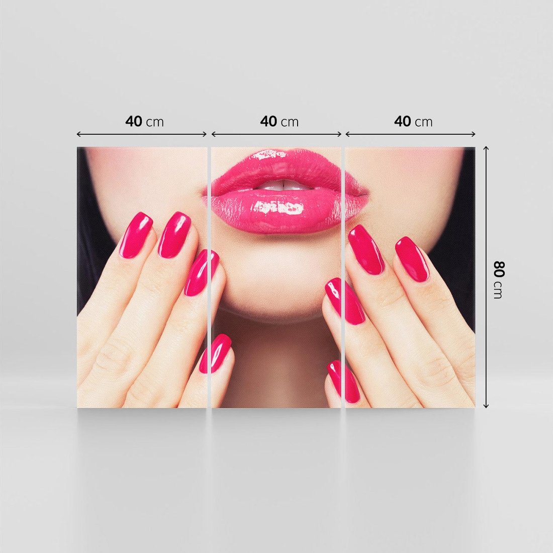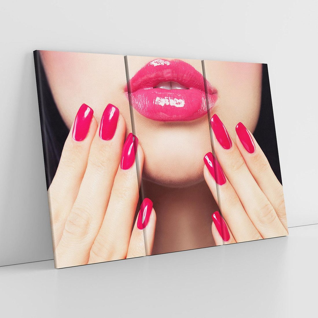 Ten stylowy obraz przedstawiający paznokcie, usta i makijaż wprowadzi do Twojego wnętrza wyrażenie piękna i indywidualności. Ciesz się subtelnością detali i dodaj wyrazistości do swojego wnętrza.